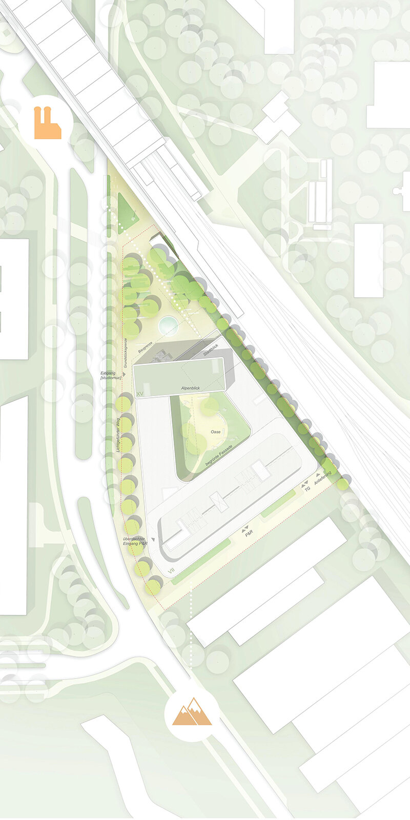 Attention was paid to Feng Shui in terms of materiality, elements and stability of architecture as follows: a stable, protruding base made of shell limestone forms the foundation of the structure. Sitting enthroned above this is a playful, curtained metal facade with various facade elements, encompassing the boarding house as well as the parking level as one unit. Finally in the joint there is a high, airspace with a warm-looking, oscillating play of light. Moreover all corners are rounded off with a 15cm radius (not recognisable in the plans due to the too small scale).