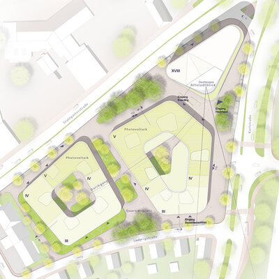 The entrances to the boarding house as well as all shops are located at road height in order to guarantee good addressability. The residents of the boarding house can while the time away on the terrace overlooking the square or protected with a view to the inner courtyard.