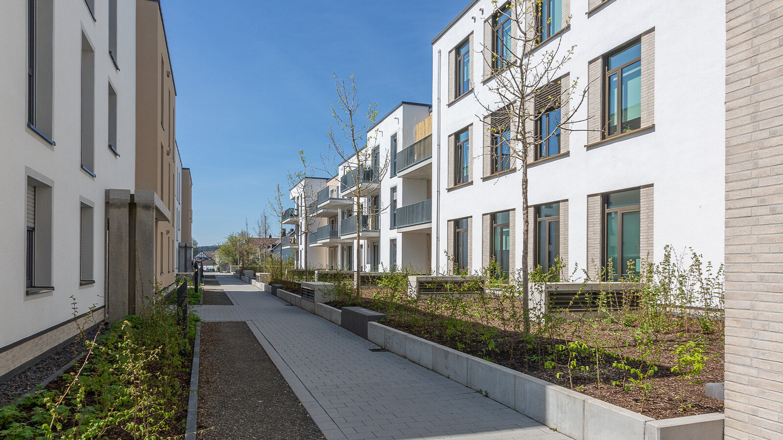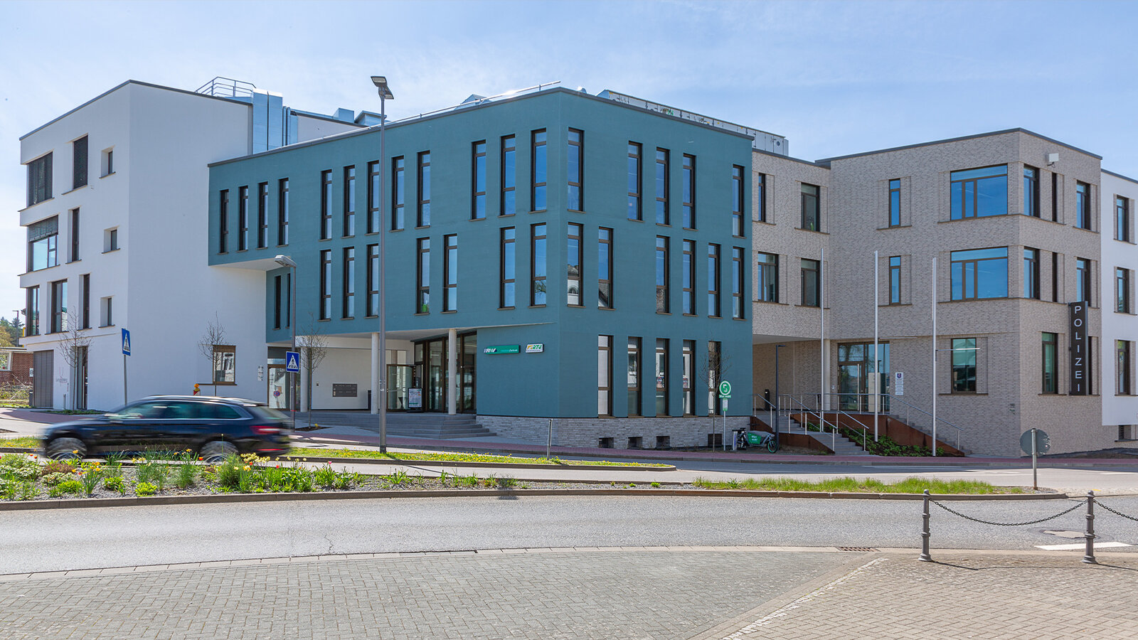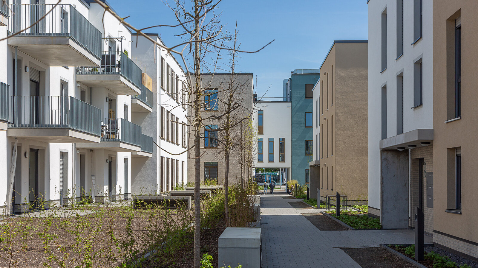 The new buildings comprise a wide mix of apartments, space for doctors' practices, offices and administrations as well as a restaurant. The building ensemble along Aalstrasse towards the bus station ends with "Haus der Beteiligung“, an office building with municipal undertakings. Special attention was paid here to the design of the entrances in terms of giving the municipal undertakings the opportunity to present in a public space and to thus promote communication with the civilians.
