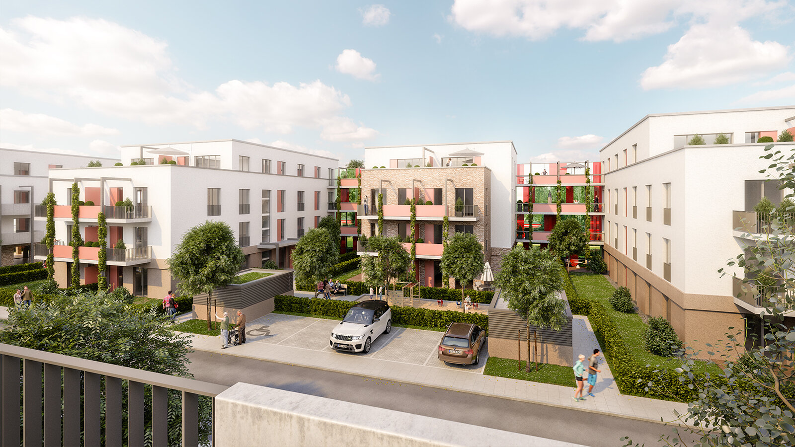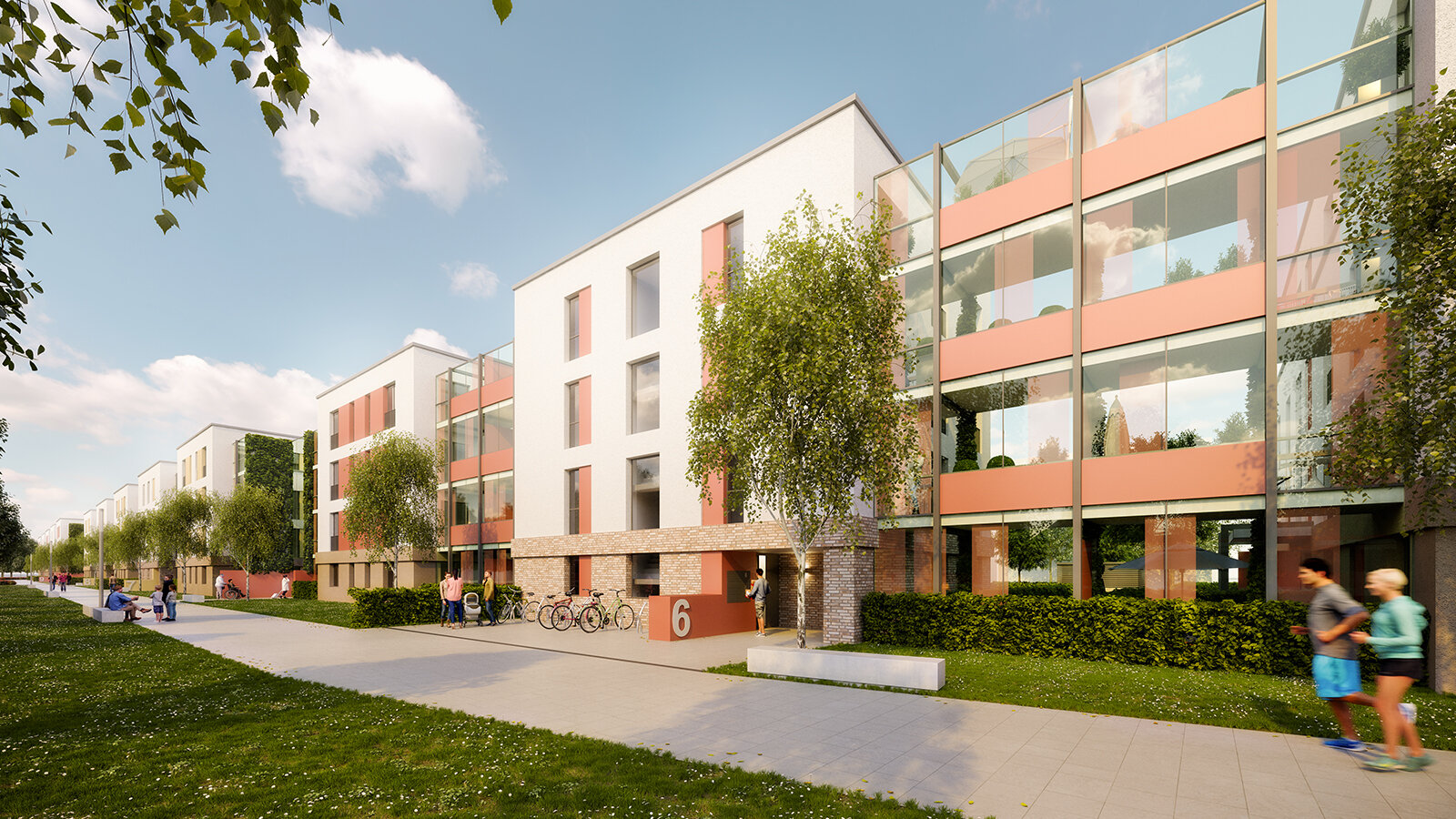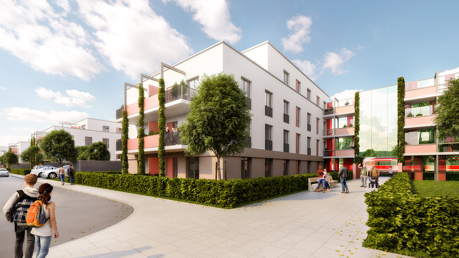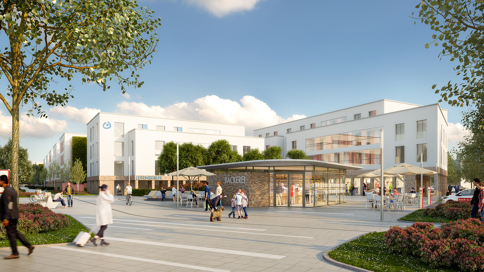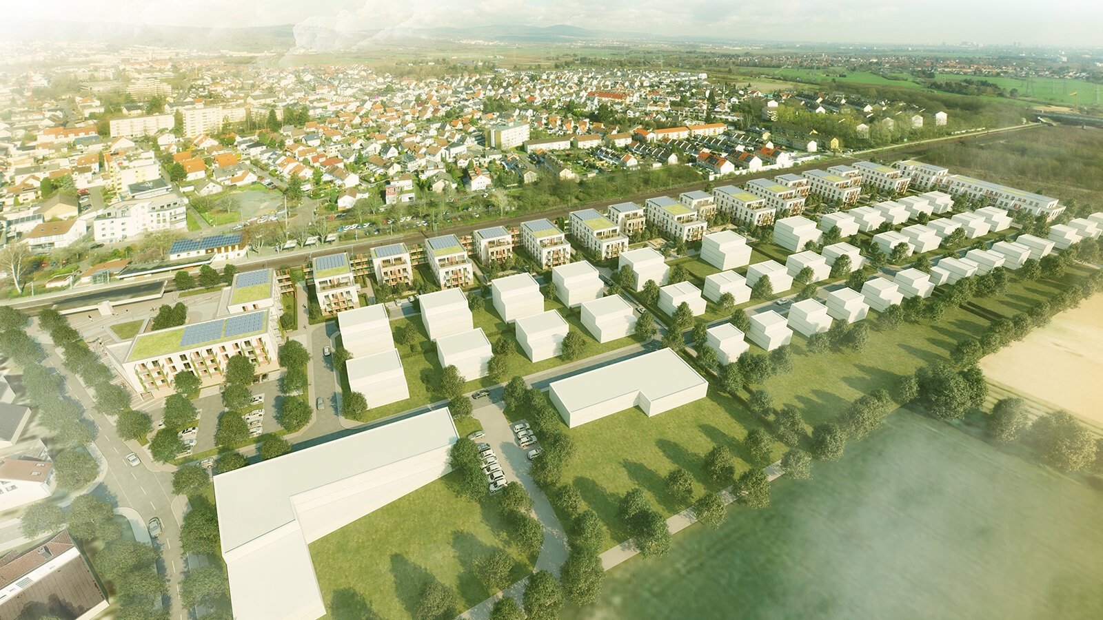 At the beginning of the district and in the direct proximity of the subway stop, there is a public district square attached to public facilities, such as the mobility centre and retail shops. A P+R station is planned for the south of the square. The design comprises an efficient energy concept, ecological measures and a sustainable mobility concept.