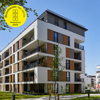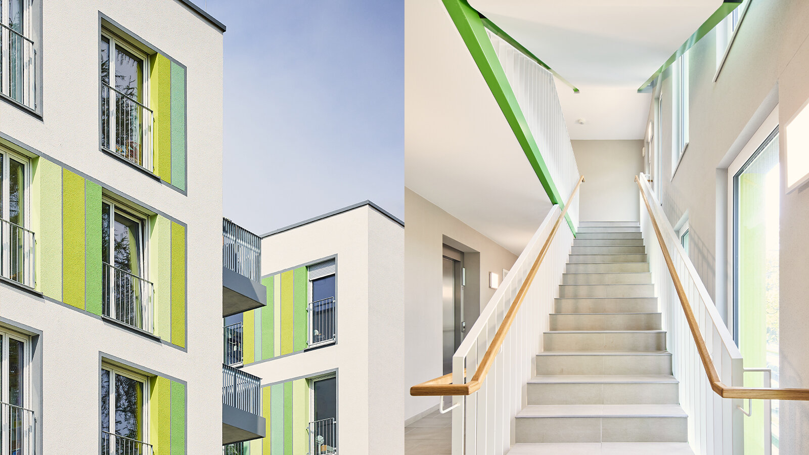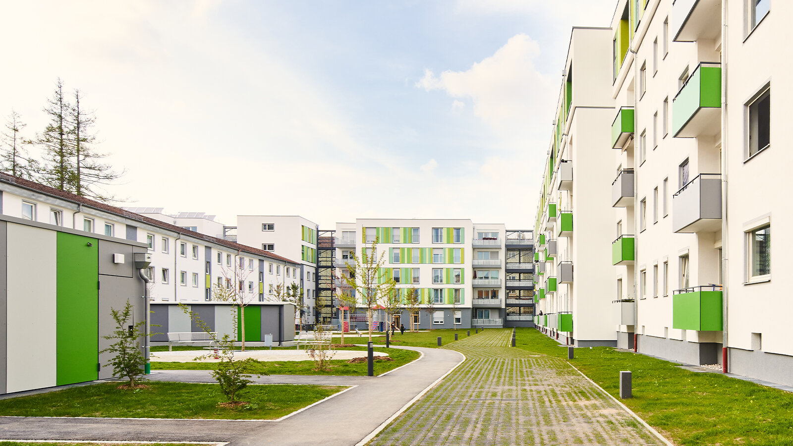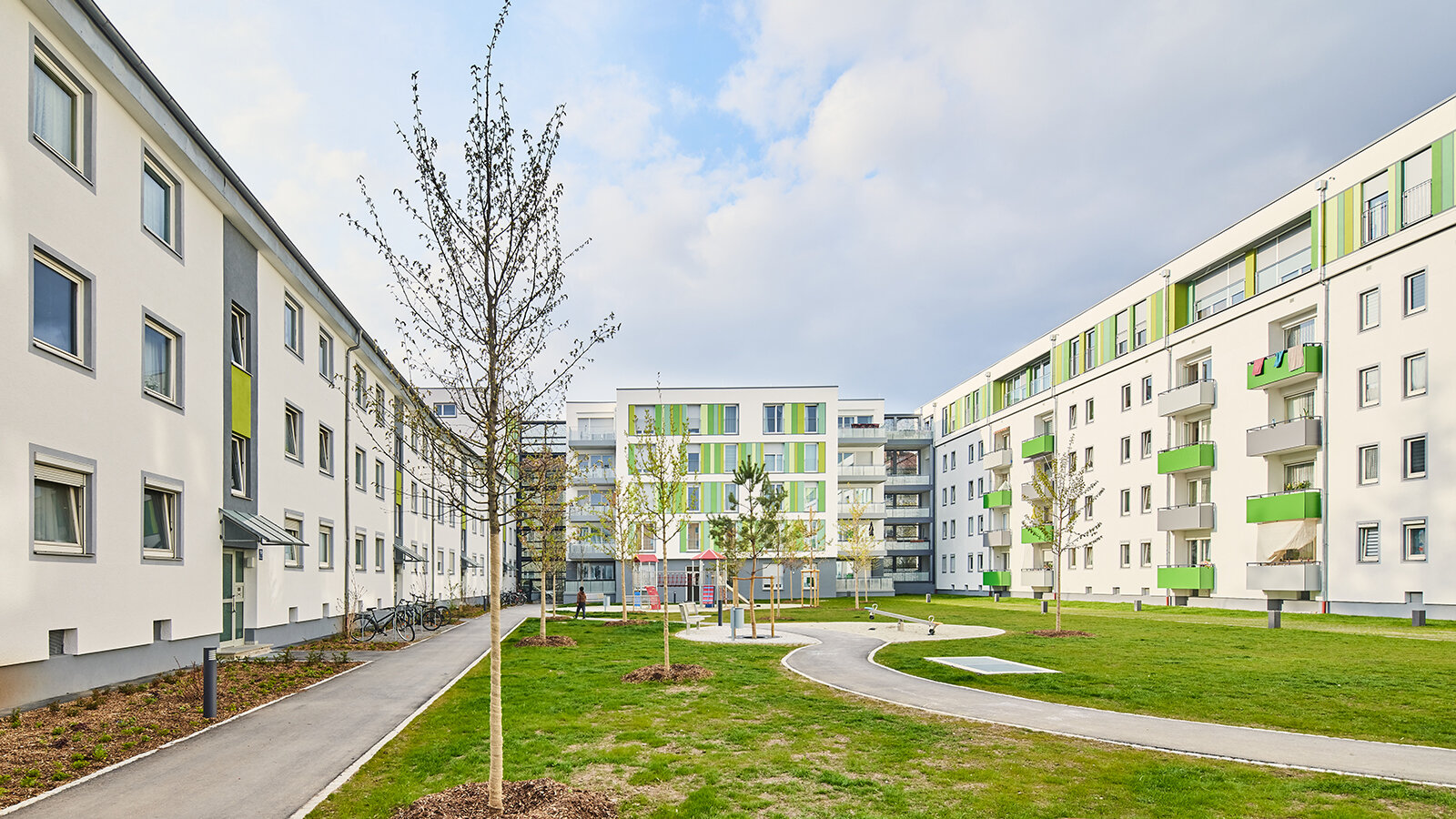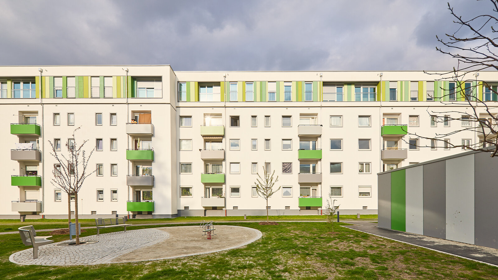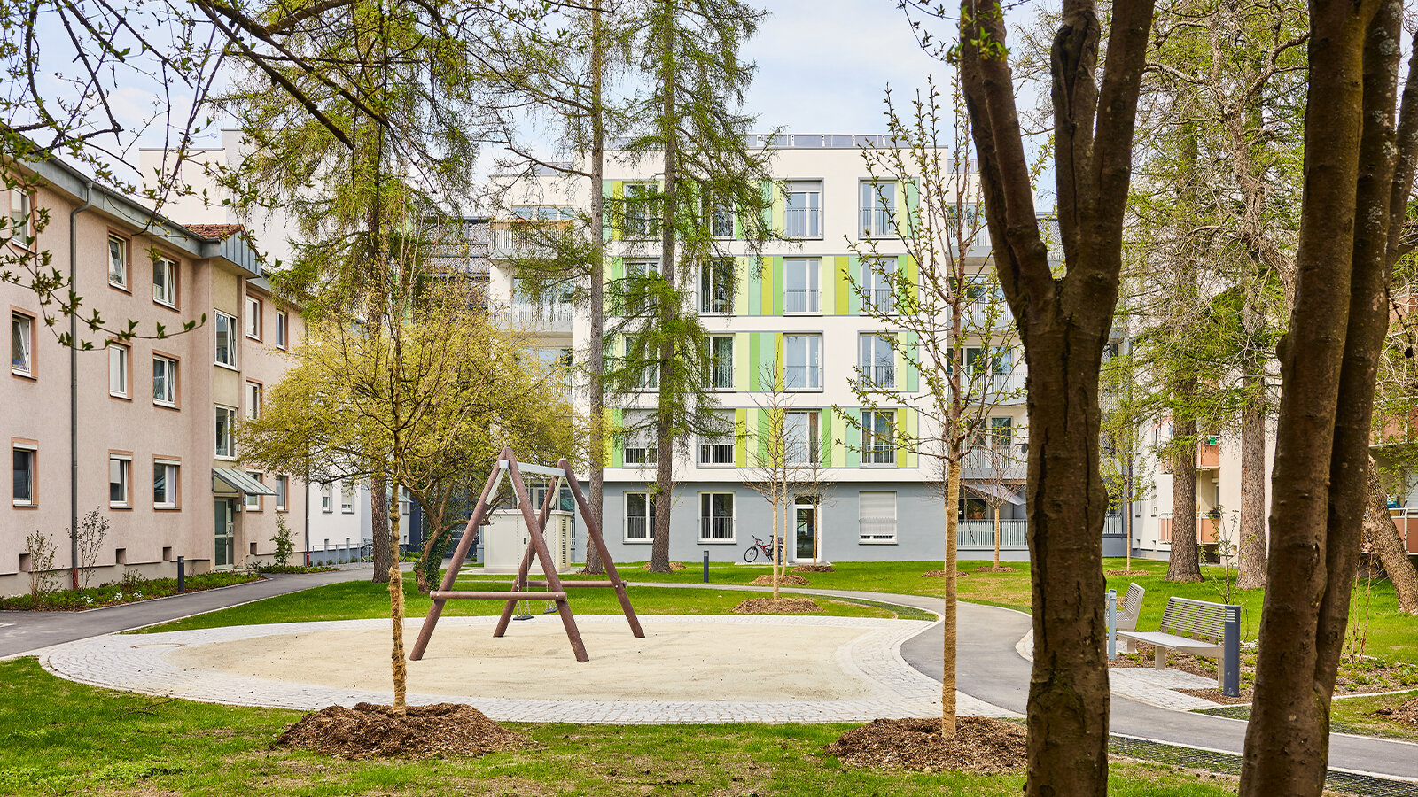 The idea was to create additional living space for the area by closing the block to the main roads and taking suitable noise protection measures. The four-storey building blocks facing Schwanseestraße and the building heads of the three other blocks facing Chiemgaustraße were provided with one or two-storey partial extensions in timber panel construction and the front sides of the buildings facing Chiemgaustraße were supplemented with three new five-storey buildings. Supported by additional noise protection walls printed with a leaf structure, these now serve as effective noise protection for the apartments and inner courtyards. While retaining many of the existing trees, these were redesigned and now offer residents a high quality of stay.