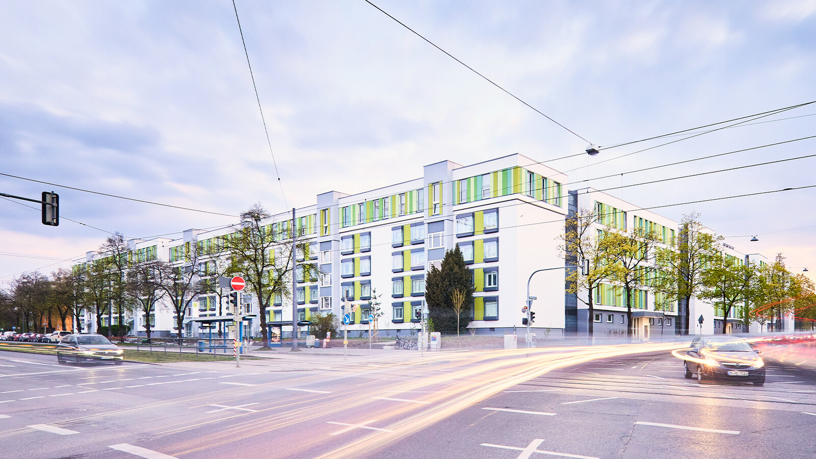 On the corner of Chiemgaustraße and Schwanseestraße in Munich's Giesing district, an inner-city residential development from the post-war period was extended and densified. The development, consisting of four blocks of buildings with park-like courtyards, was getting on in years and had no sound insulation from the busy Mittlerer Ring.