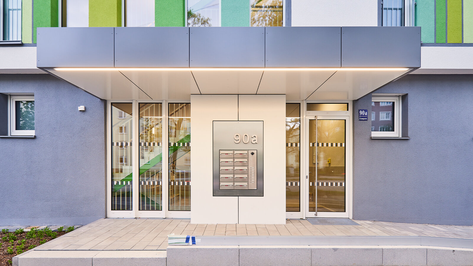 The street-facing parts of the building were given soundproof windows and front boxes facing the street as well as balconies facing the quiet inner courtyard. In order to make the structural addition clearly legible, the perforated façades of the existing buildings were retained, while the extensions and new buildings were given horizontal ribbon windows. In total, 48 new apartments were created (11 of them with income-oriented social assistance) and a single-storey underground garage with 37 parking spaces under one of the inner courtyards.