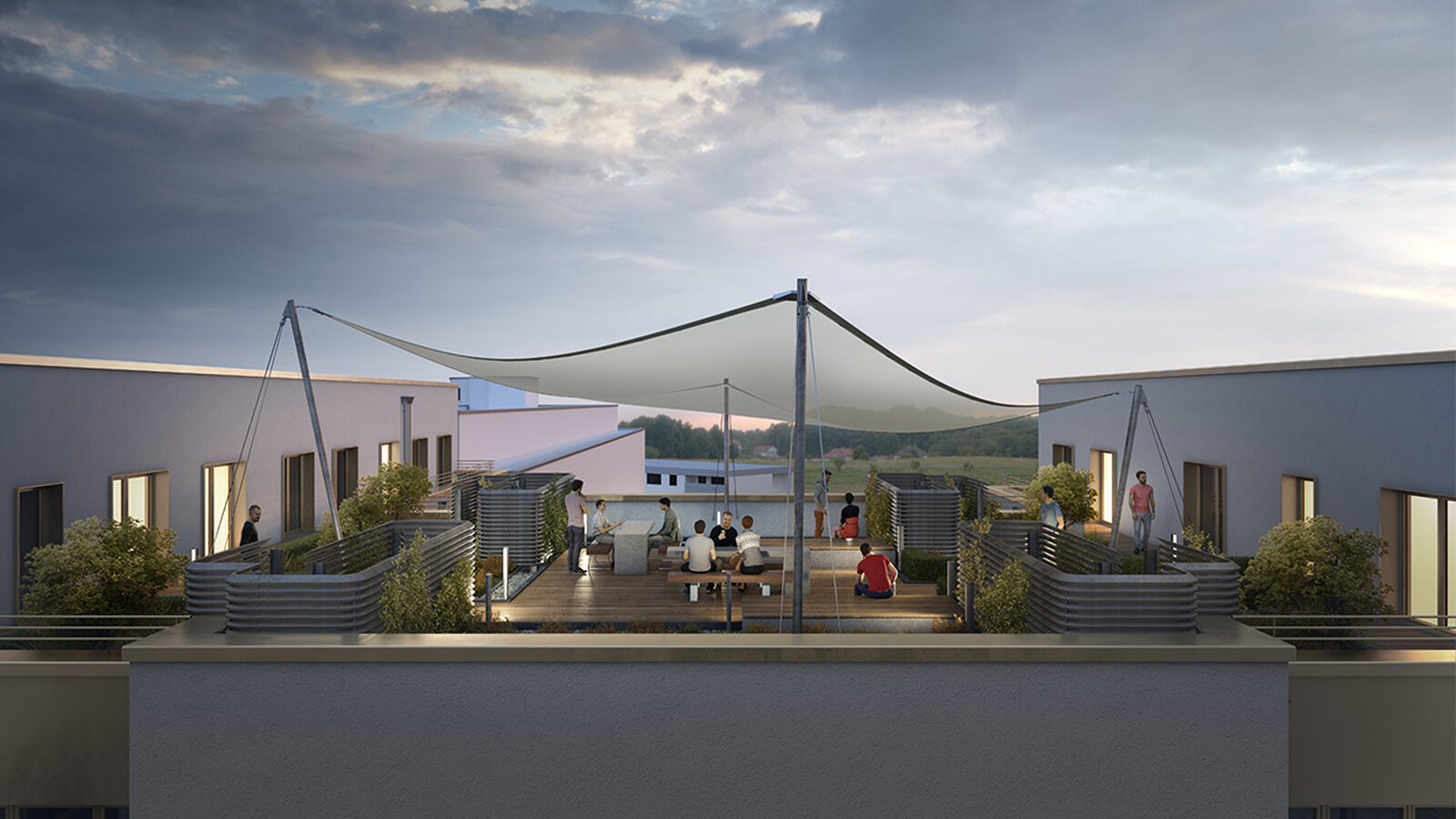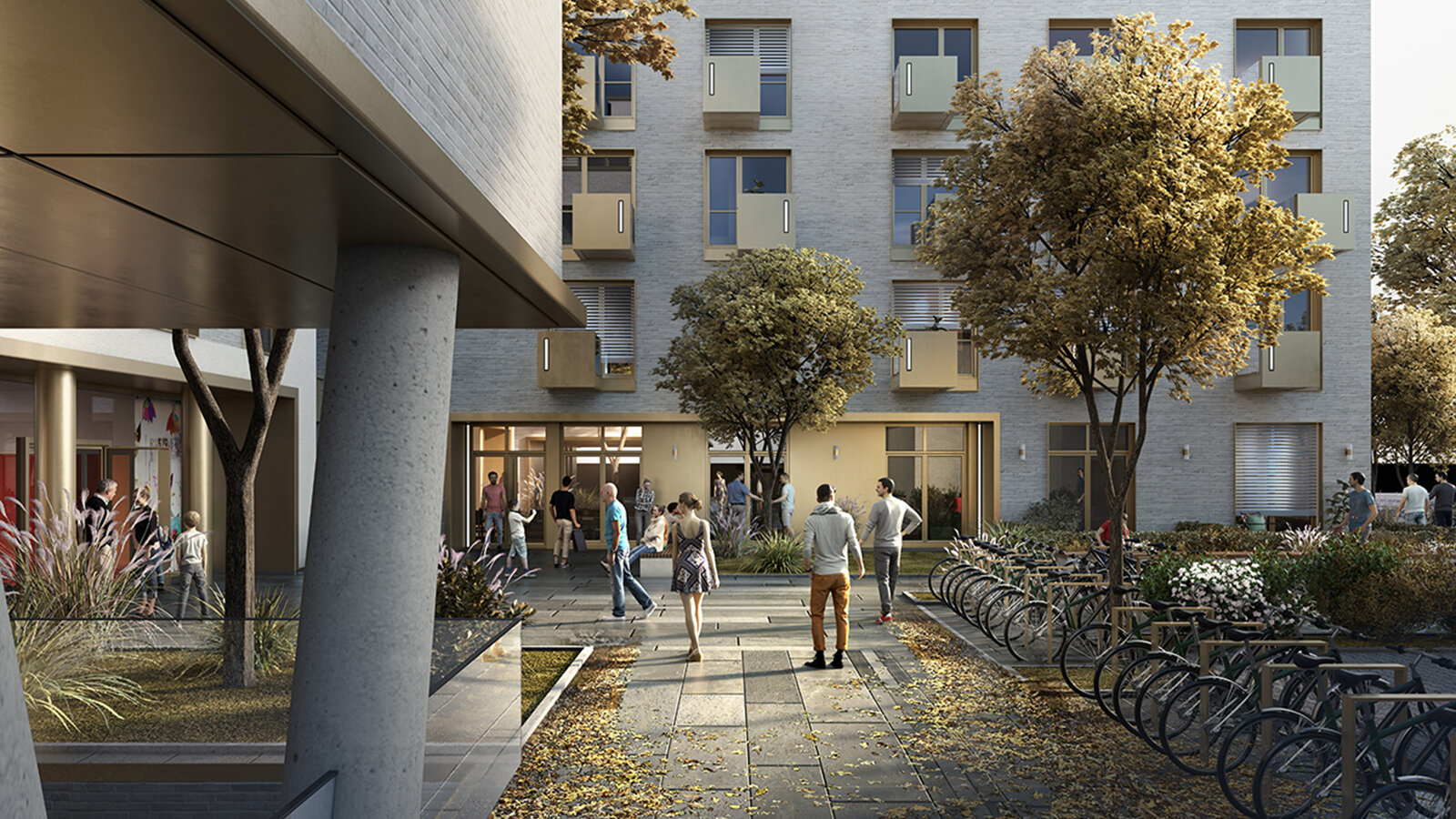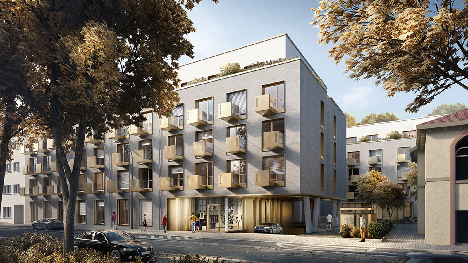 A new building complex is being constructed on a former completely sealed off site of a small local supplier with a large car park area, clarifying the urban heterogenous situation and creating high-quality living space. With two five-storey structures that form a group around an urban interior courtyard together with a connecting structure, the new building creates space for attractive, urban living and a ground level day-care facility for children with a parents’ café and offices. The day-care facility for children faces a quiet interior courtyard and offers space for 99 children aged between 1 and 6 years of age. The apartments can be accessed through two separate entrances, each with its own balcony. Along with private roof gardens on the green roof areas there are also communicative open spaces with wide-ranging views. The housing offer comprises 171 one to two room apartments with areas between 22 and 60 square metres. In addition, a two-storey underground car park was designed with 89 car parking spaces and 195 bicycle spaces.