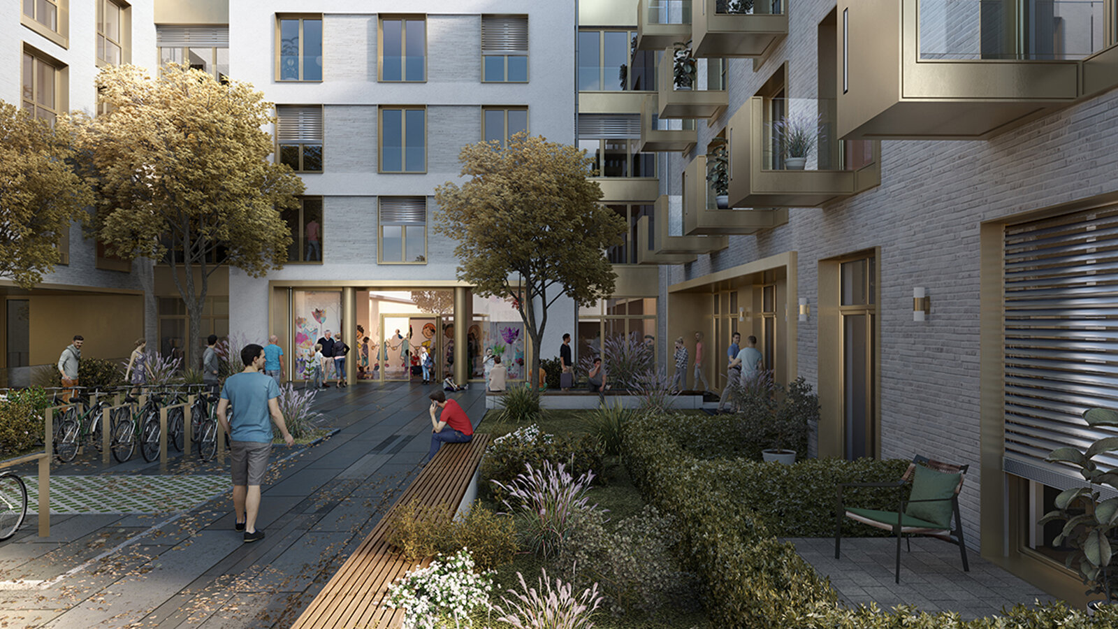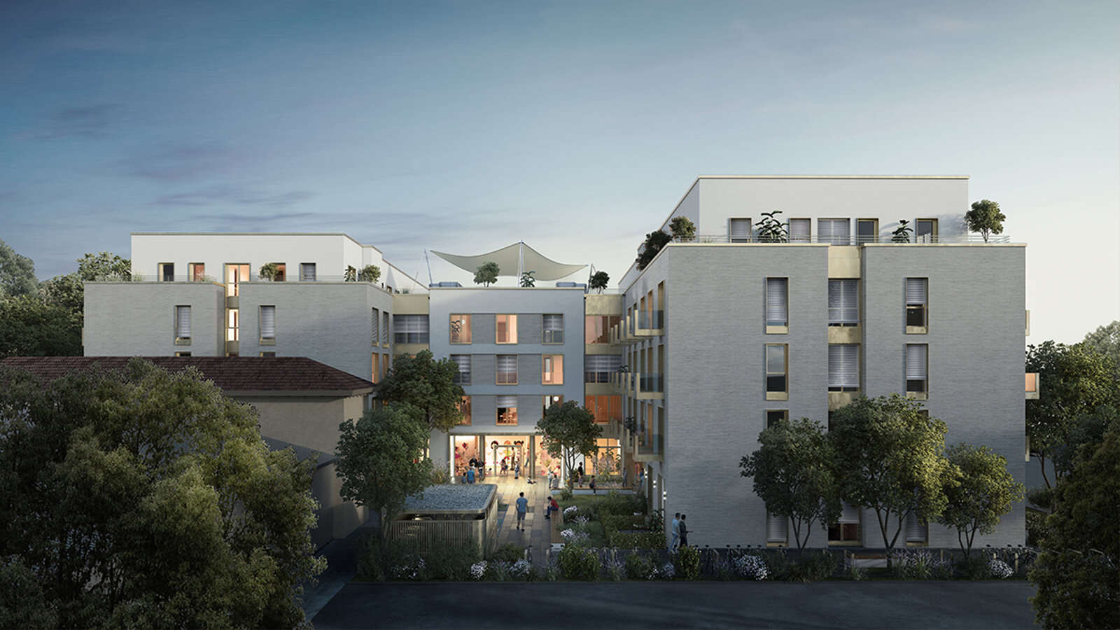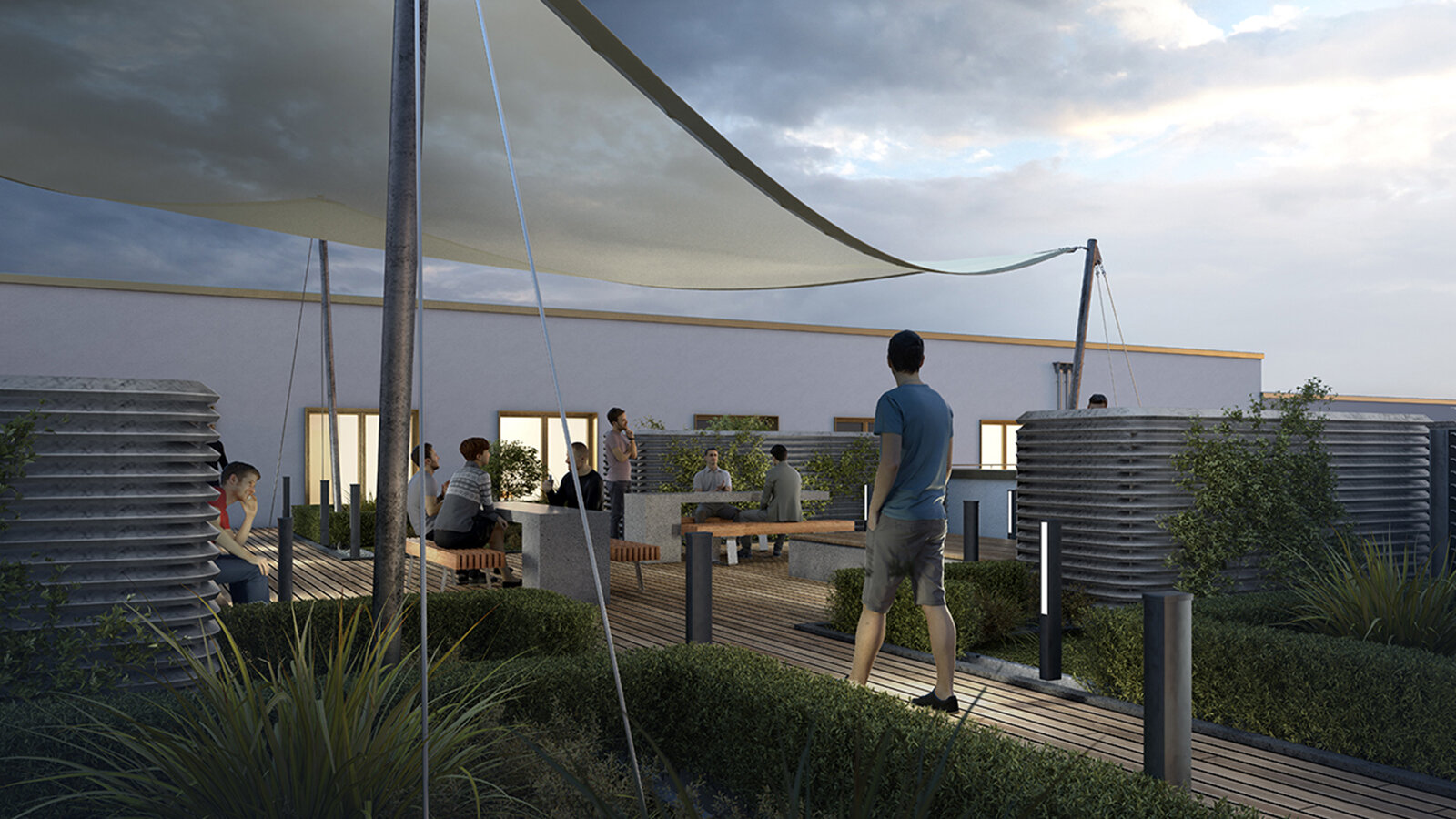 A new building complex is being constructed on a former completely sealed off site of a small local supplier with a large car park area, clarifying the urban heterogenous situation and creating high-quality living space. With two five-storey structures that form a group around an urban interior courtyard together with a connecting structure, the new building creates space for attractive, urban living and a ground level day-care facility for children with a parents’ café and offices. The day-care facility for children faces a quiet interior courtyard and offers space for 99 children aged between 1 and 6 years of age. The apartments can be accessed through two separate entrances, each with its own balcony. Along with private roof gardens on the green roof areas there are also communicative open spaces with wide-ranging views. The housing offer comprises 171 one to two room apartments with areas between 22 and 60 square metres. In addition, a two-storey underground car park was designed with 89 car parking spaces and 195 bicycle spaces.