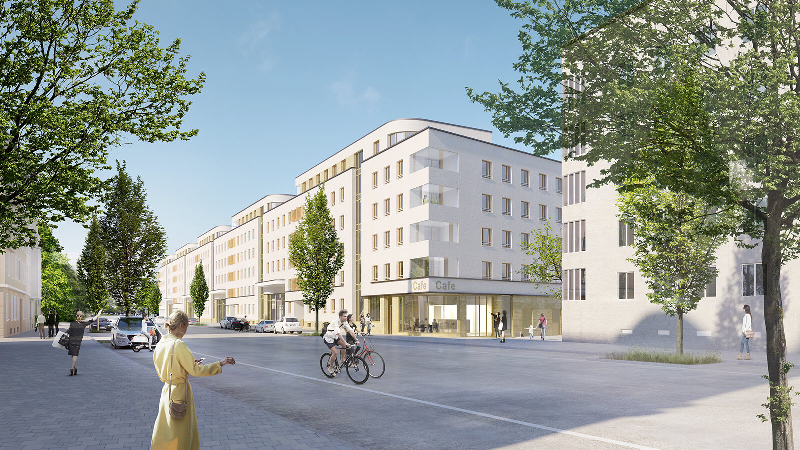 The clear position on sealing off the traffic noise is reflected in the facade of the residential building on Plinganserstraße. With discreet materials and a pleasant rhythm, the design forms a clearly defined urban edge to the street and the green sports park in the east. Based on the landmark architecture of the listed existing building in the north, which forms the entrance to the district "Am Harras", the facade of the new building is kept unpretentious in its design of the punctuated facade and makes reference to the important urban edge of the residential area from the 1920s. Accesses on the ground floor and the recessed fifth upper storey divide the around 170 m long facade and emphasise the building and district accesses. A clear prestige value is created.