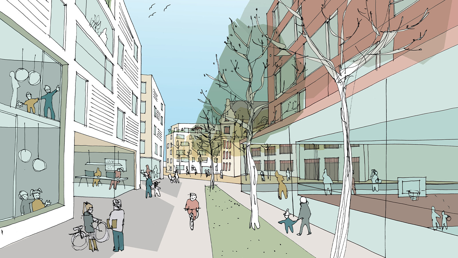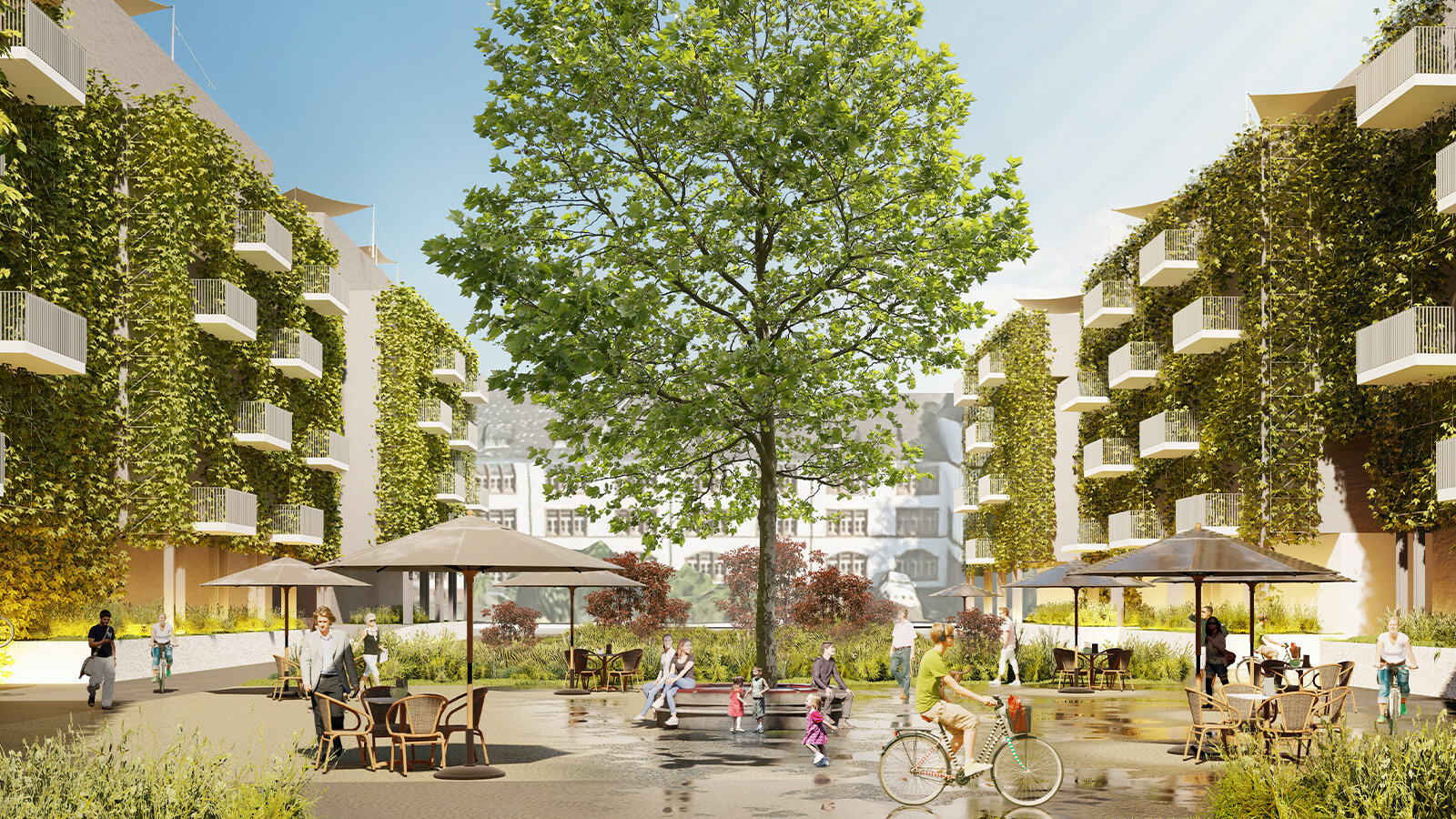 The district is planned to be car-free with a small-scale route for pedestrians and cyclists. The sustainable mobility concept includes a neighbourhood garage and an additional mobility hub, a direct connection to the existing bus stop, sharing services for cars and bicycles and a charging infrastructure for e-mobility. Fresh air corridors with their high proportion of greenery (façade greening, trees) ensure a cooling effect within the district, while new tree planting provides optimal shade for the buildings, public squares and pathways. The compact design, the use of sustainable materials, renewable energy sources (PV systems and heat pumps), a concept for heat recovery, the formation of energy clusters in the residential courtyards and the reuse of rainwater and process water will create a resource-conserving and sustainable district.