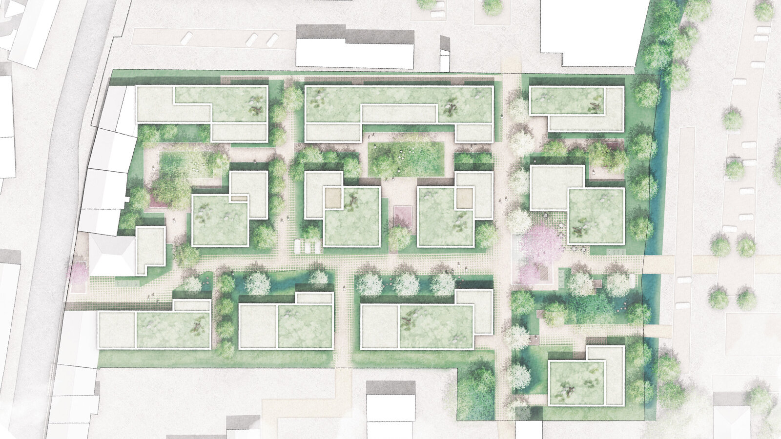 A modern residential quarter is to be built on the former site of the Westpfälzische Verlagsdruckerei (WVD) printing works in the centre of the town of St Ingbert. Together with Bäuerle Architekten and KRAFT.RAUM Landschaftsarchitektur und Stadtentwicklung, planquadrat submitted a design that was awarded first prize. The urban development concept focuses on a balanced mix of commercial, residential and recreational areas and creates a quiet and high-quality living space in a lively neighbourhood. Clear building edges facing the busy road and neighbouring businesses protect the neighbourhood from external noise pollution. In addition, the neighbourhood can be made traffic-calmed by a neighbourhood garage located outside.