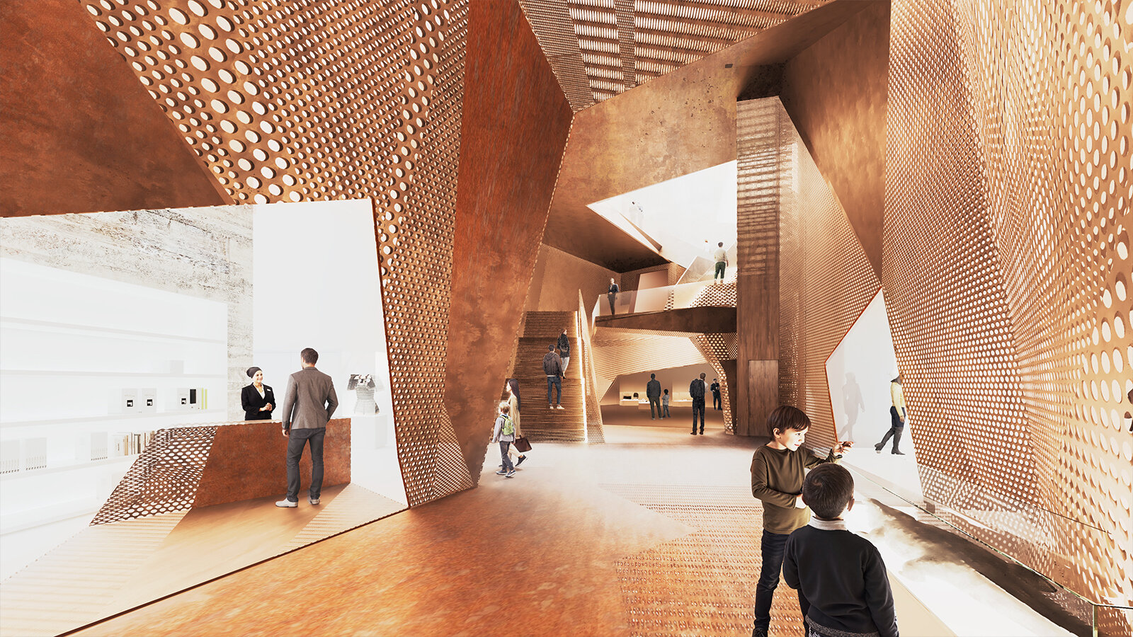 An architectural competition was held to plan the urgently needed structural, energy and content modernisation of the German Leather Museum in Offenbach. Our “Nexus” concept envisages a new three-storey building to the south of the historic building, which is connected to the existing building by a glass atrium zone. At the heart of the design is a polygonal, sculptural steel structure that serves as a landmark and houses the ticket office and museum store. The exhibition areas were deliberately designed without daylight in order to protect the sensitive exhibits from UV radiation and to enable atmospheric lighting effects.