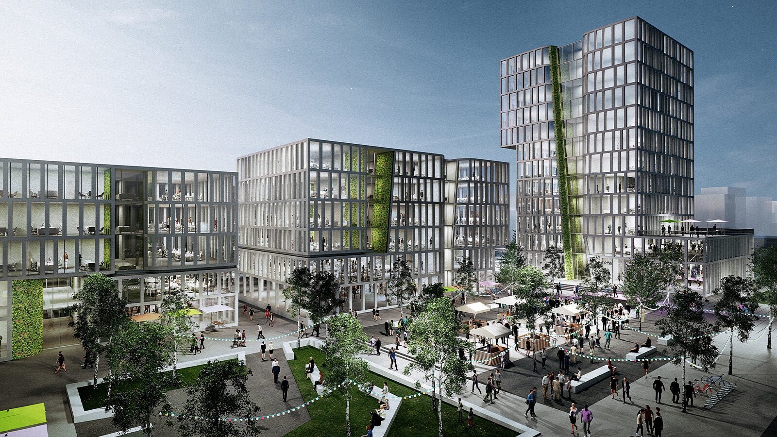 In relation to the urban scale of the immediate commercial surroundings, four functional urban building blocks are arranged around the square, which, with their staggering and loose grain, allow permeability and motor-free movement in all directions. The dimensions of the buildings relate to the commercial buildings to the north and thus form the urban link to the urban development concept for the entire site. At the corner point to Erlanger Strasse, a striking high point is formulated that functions as the urban address of the neighbourhood.