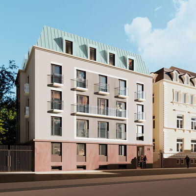 In order to utilise this potential accordingly, the design concept envisages a striking, tower-like configuration. A newly generated identification factor for the entire neighbourhood, which completes the existing block structure as an urban planning element. This urban planning system is also continued in the neighbouring properties. There, too, the system was integrated into the neighbourhood concept in the same way and thus closes the rear courtyard of the peripheral development. The silhouette of the residential building is characterised above all by the striking incisions at the entrance and the contrast between the roof terraces and the calm façade. Square openings in a diagrammatic grid dominate here. The shiny metallic reveals and panels deliberately create accents whose earthy colours are reminiscent of the local castle sandstone.