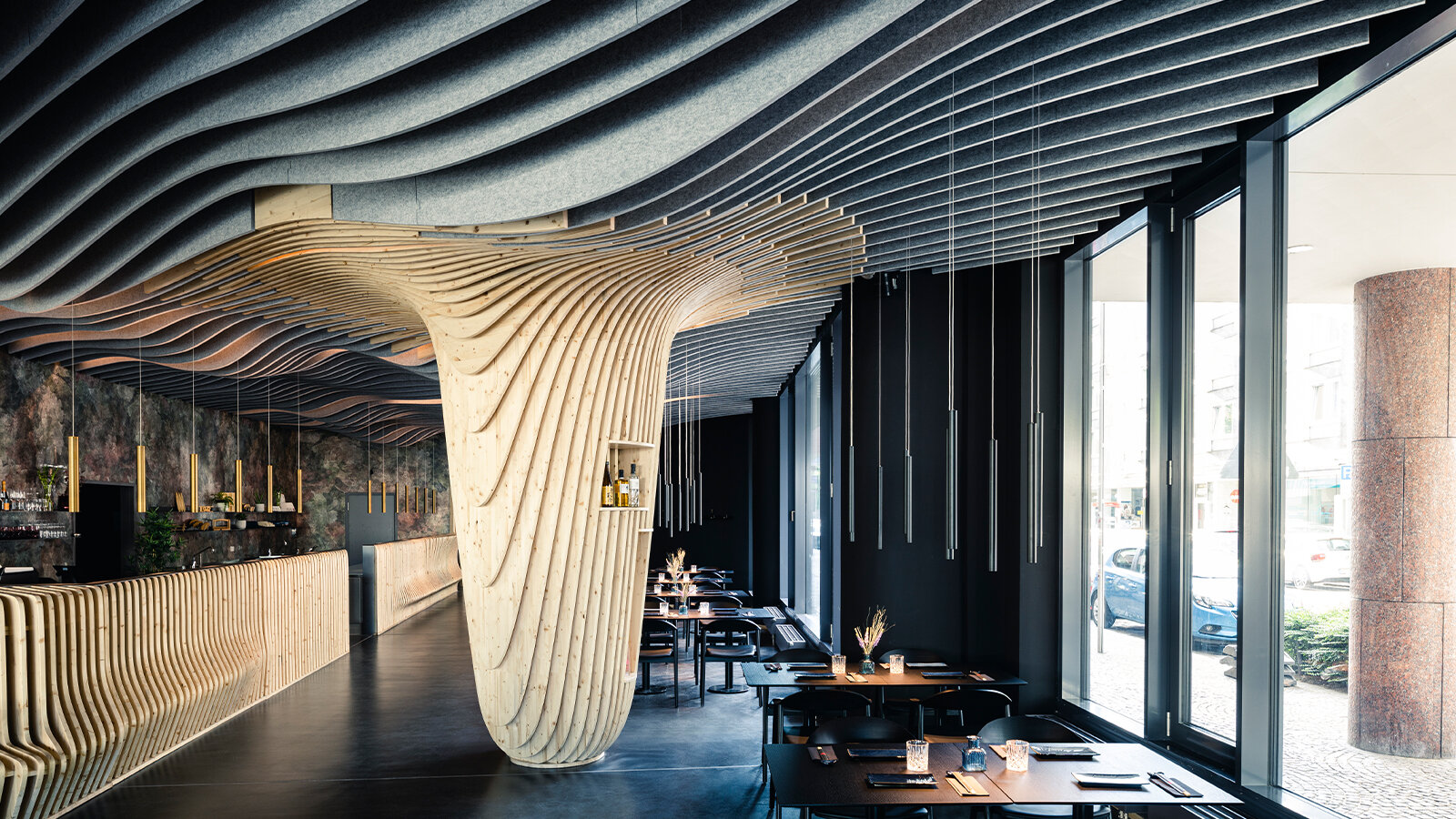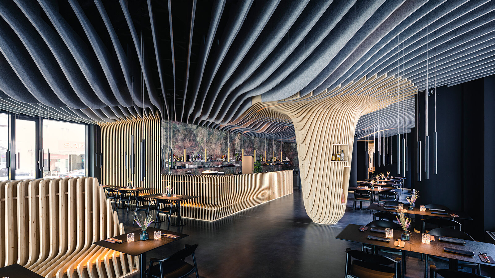 For the new sushi restaurant in the heart of Nuremberg, we developed a holistic concept for the remodelling and redesign of the existing building. This envisages a modern interpretation of Far Eastern dining culture in terms of colour and materials. With this in mind, the high-quality catering space on the ground floor of the Adina Hotel Nuremberg was completely extended during ongoing operations. The dining area presents a lively picture of a symbiosis of wooden elements and acoustic objects. These develop a flowing wave structure that extends from the ceiling over the walls to the floor of the restaurant, where it rises up again as seating furniture. Guests can choose between more intimate seating areas in the secluded area of the dining room and an open atmosphere in the bistro area at the front.