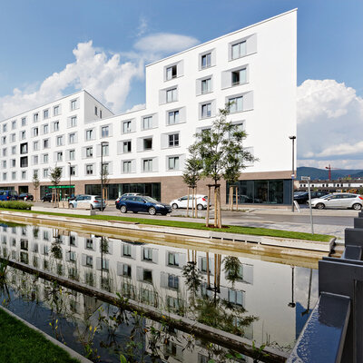 The hall of residence was built in Heidelberg and is part of the Bahnstadt development in which all buildings were constructed to passive house standards, including the hall of residence at the main axis of Bahnstadt, the "Langen Anger“. The angled building with its main facades at Langen Anger and Nightingalestraße offers 218 residential units, of which 3 units were built suitable for wheelchairs. All others were planned as barrier-free apartments.