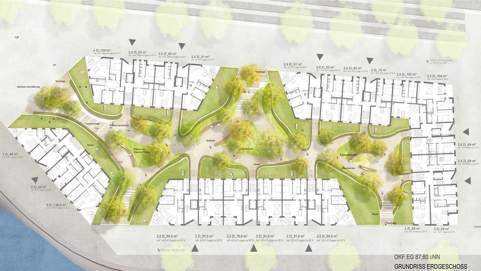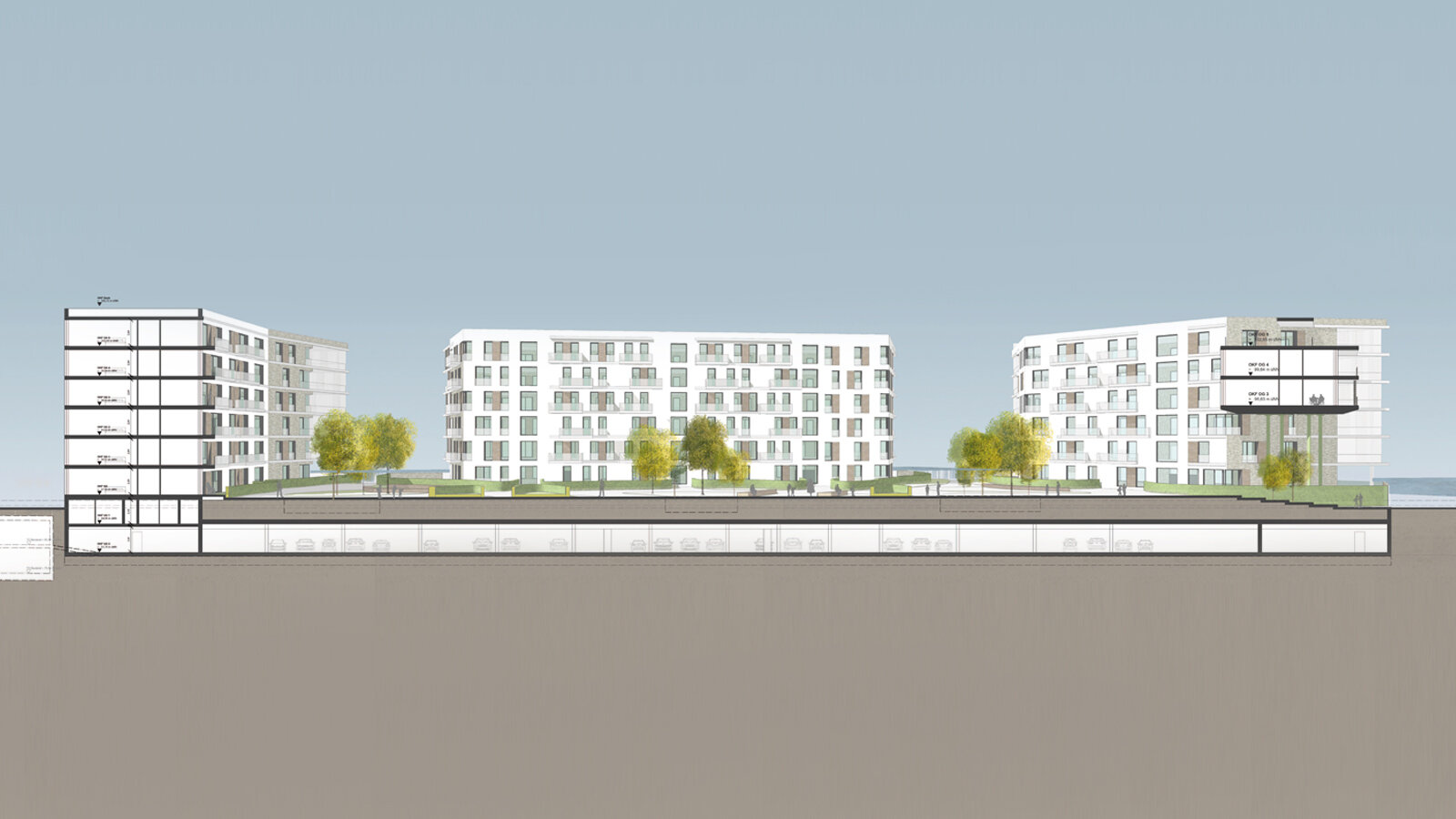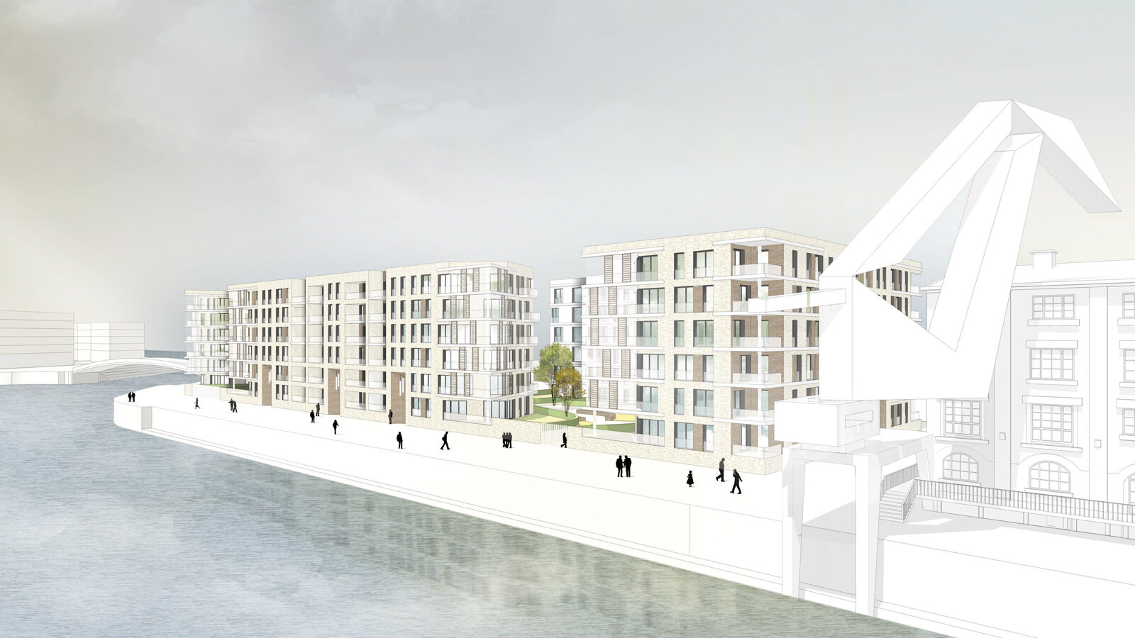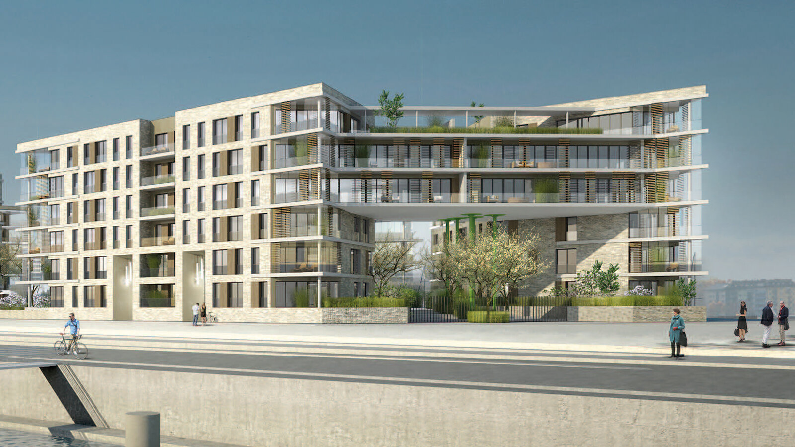 The planned residential housing at Molenkopf takes into account the special place at Mainz customs port due to its striking architecture. A spacious glazed building bridge represents the front of the building facing towards the harbour thoroughfare. The competition procedure went through two phases, whereby the form based on the master plan guidelines was intentionally developed further. Due to its structure the building generates a private inner courtyard, minimises the shade and at the same time enables the view from all apartments to the harbour and/or to the River Rhine. In its architecture and materiality, the building makes reference to the neighbouring historical wine storehouses. Through the organisational division of the structure, three independently functioning owned apartment communities (WEG) emerge that can each be marketed separately. Most apartments acquire an additional high quality through the enabled "living through concept". The floor plans are designed flexibly so that the apartments can be used either with open plan living and cooking areas or separate kitchens. The competition contribution was considered with one of two first places without asserting itself in the final decision.