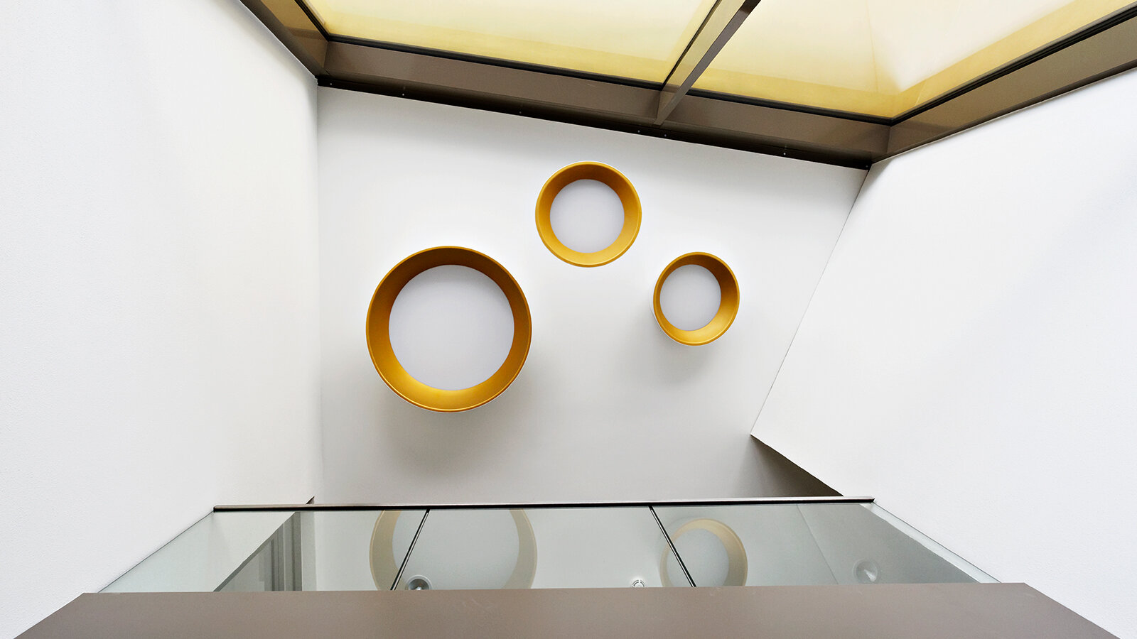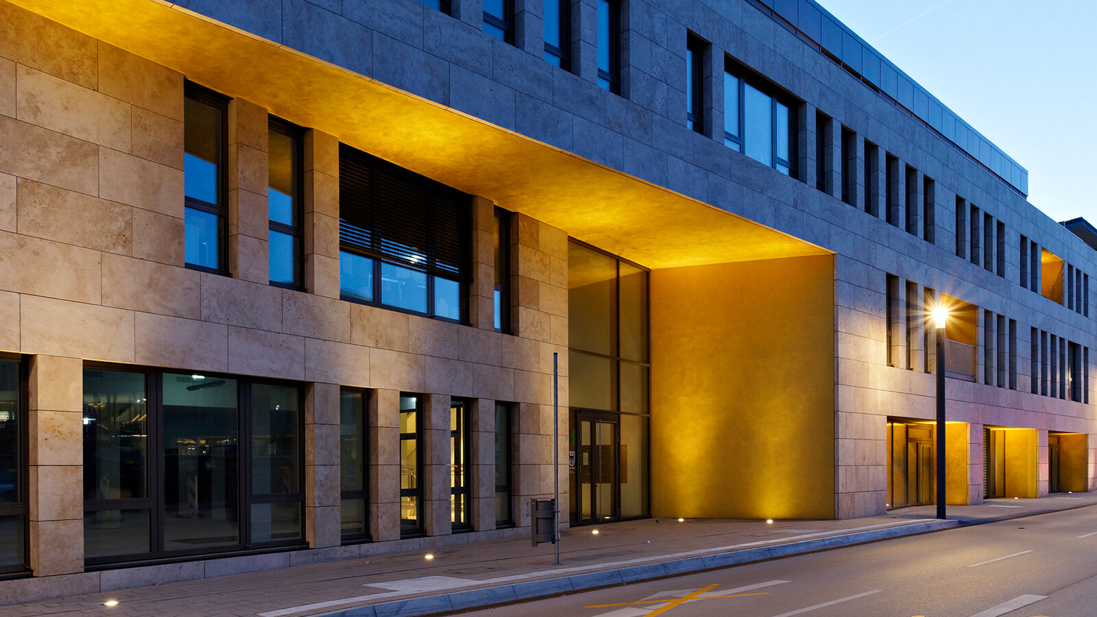 Aus dem monolytischen, in hellem Naturstein gehaltenen Baukörper ist der Eingangsbereich zweigeschossig herausgenommen und in den Baukörper eingeklappt. Somit präsentiert sich das Gebäude mit einer einladenden Geste Richtung „Neuer Markt“ und schafft darüber hinaus einen großzügigen Vorbereich von dem Eingang. Die goldene und effektvoll beleuchtete Einfassung unterstützt diese Wirkung.