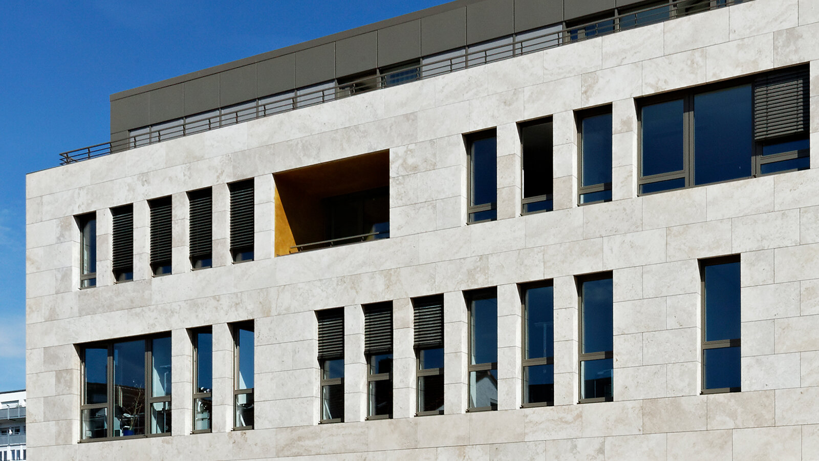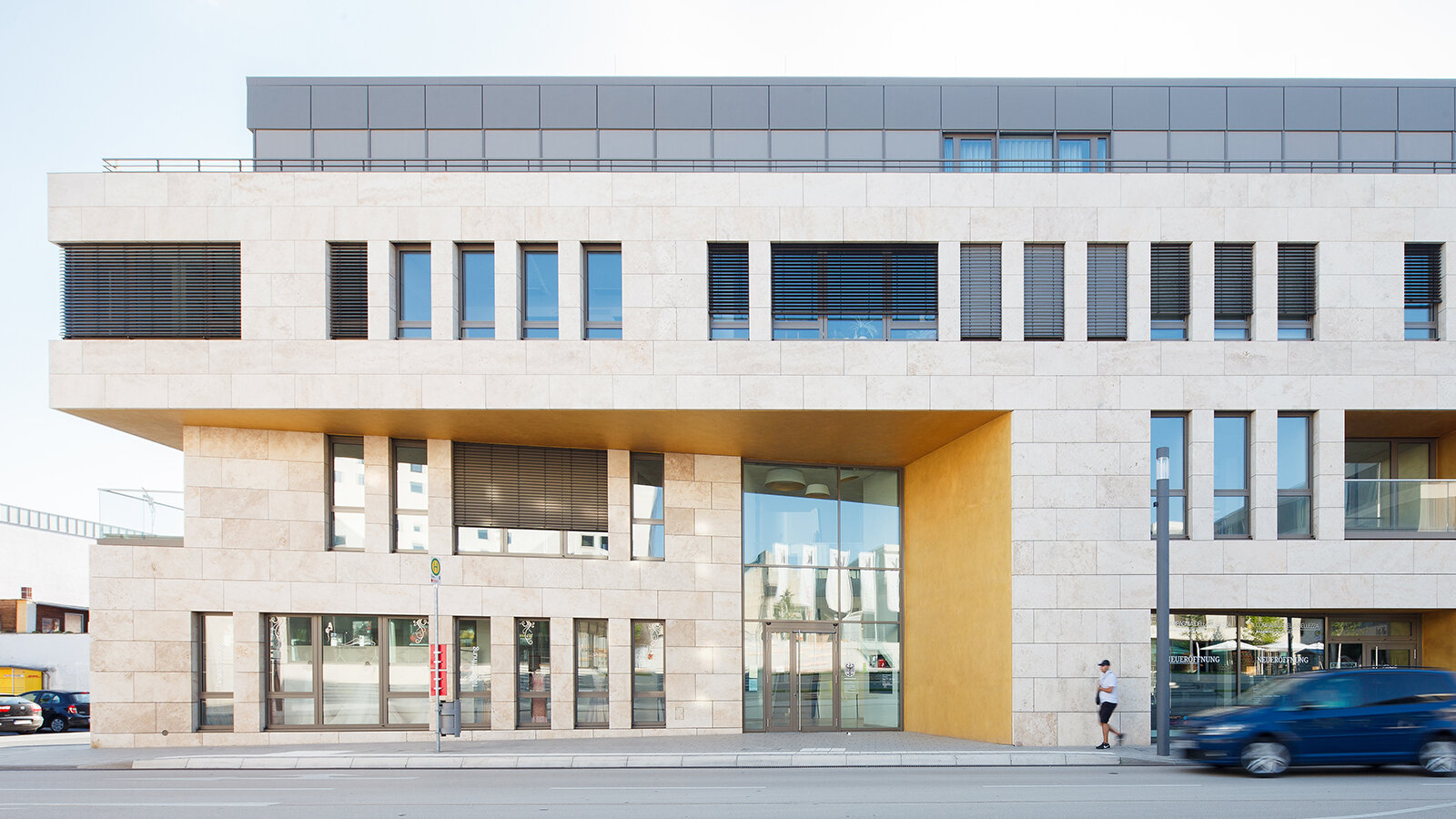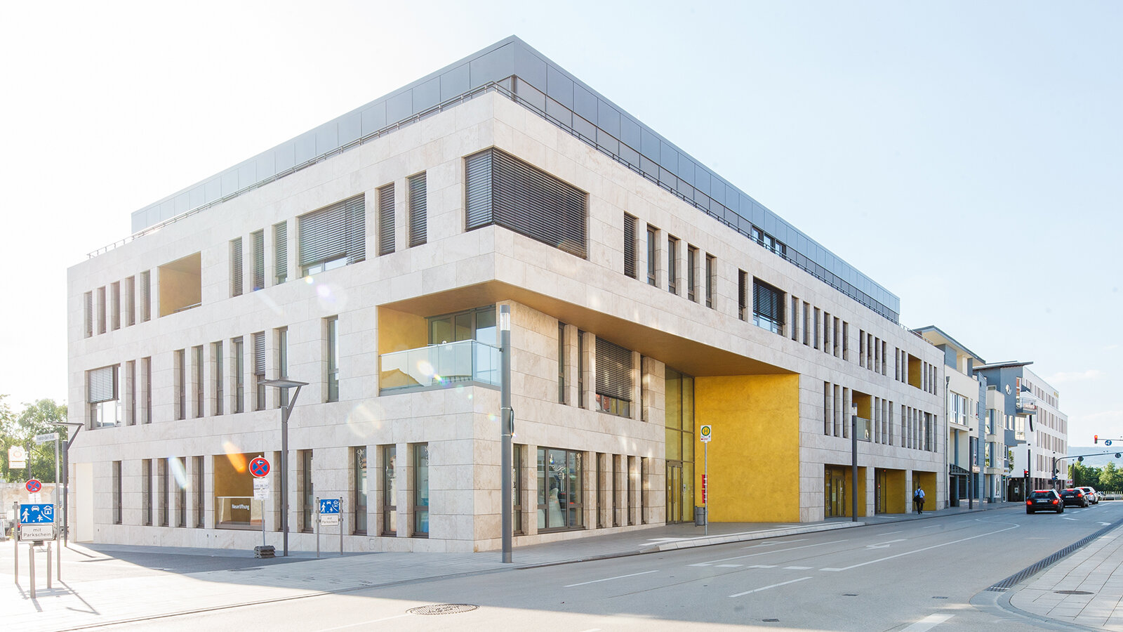Das neue Dienstleistungsgebäude schließt den Blockrand an der Seite Gartenfeldstraße und Friedrich-Ebert-Straße ab und gibt damit dem gegenüberliegenden „Neuen Markt“ einen klaren Abschluss in westlicher Richtung. In seiner Maßstäblichkeit passt er sich der umliegenden Bebauung an.