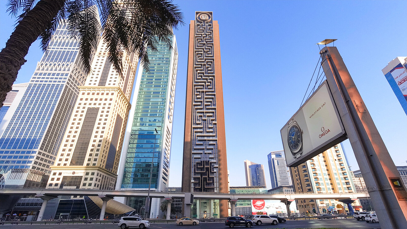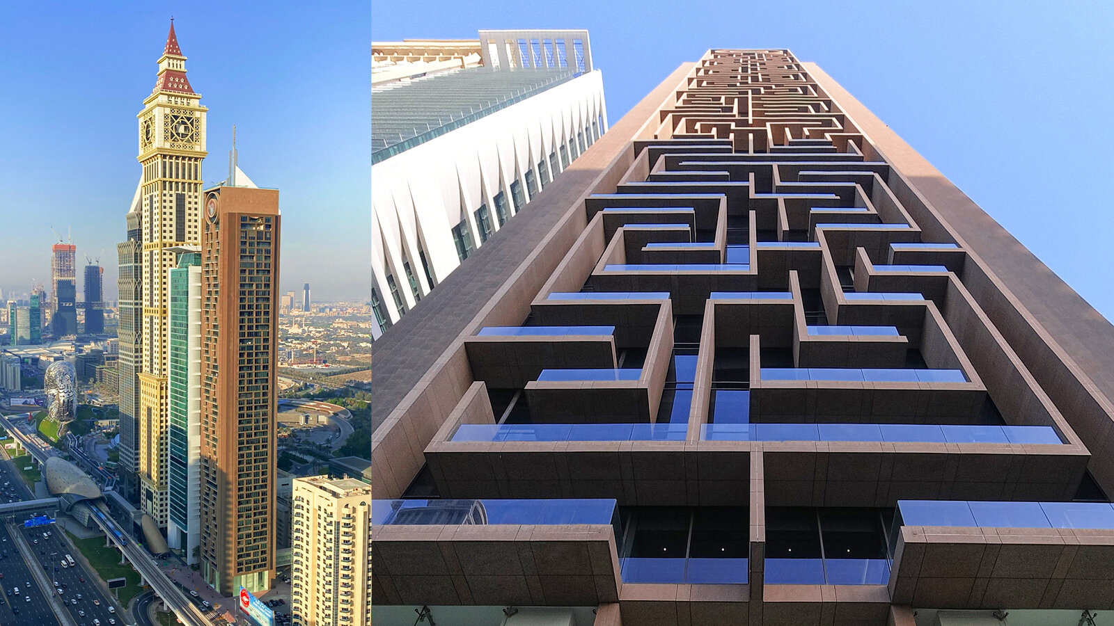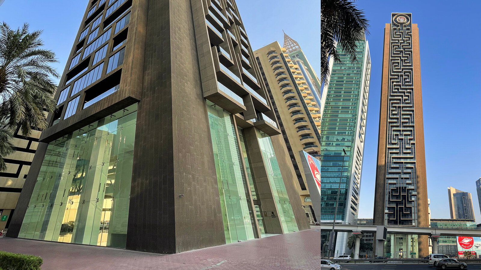 Der Rostamani Tower befindet sich an der Hauptverkehrsader Sheik Zayed Road im Herzen Dubais und ist Teil einer eng aufeinander folgenden Reihe von Hochhäusern. Diese besondere städtebauliche Situation und die Exklusivität des Ortes erfordern eine markante Straßenfassade als imagebildendes Aushängeschild. Dieses entsteht durch auskragende Wand- und Deckenscheiben, die sich wie Mäander die Haupt- und Rückfassade nach oben winden. Dadurch entsteht das Bild eines vertikalen Labyrinths, dessen Startpunkt der Haupteingang und Zielpunkt das obere „Auge“ bildet. Neben einem charakteristischen Fassadenbild schaffen diese Elemente Schutz vor Sonne, Wind und Straßenlärm.