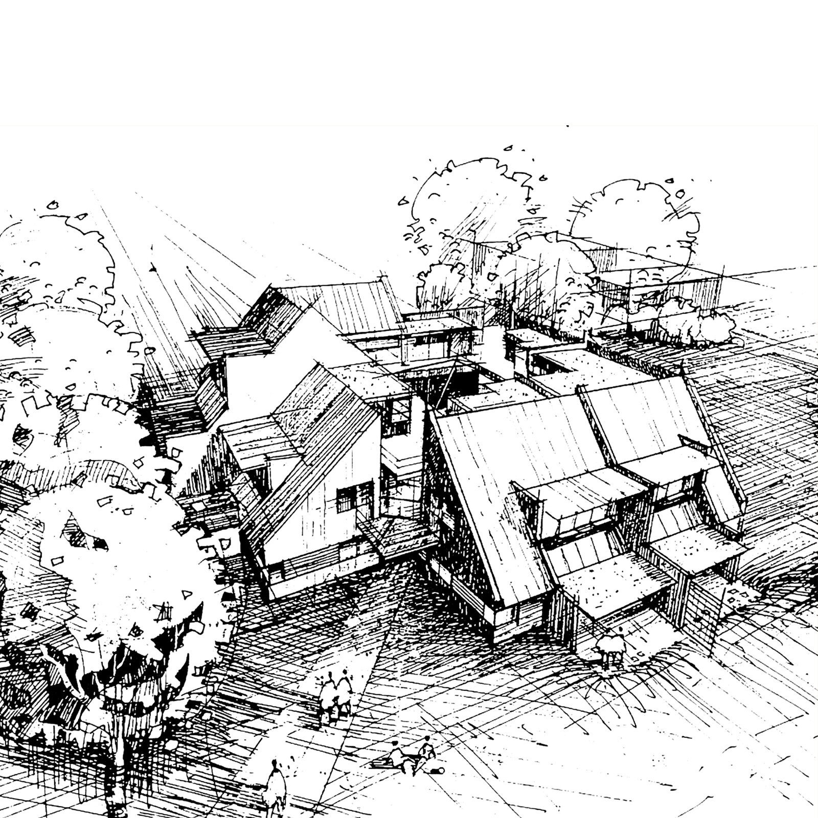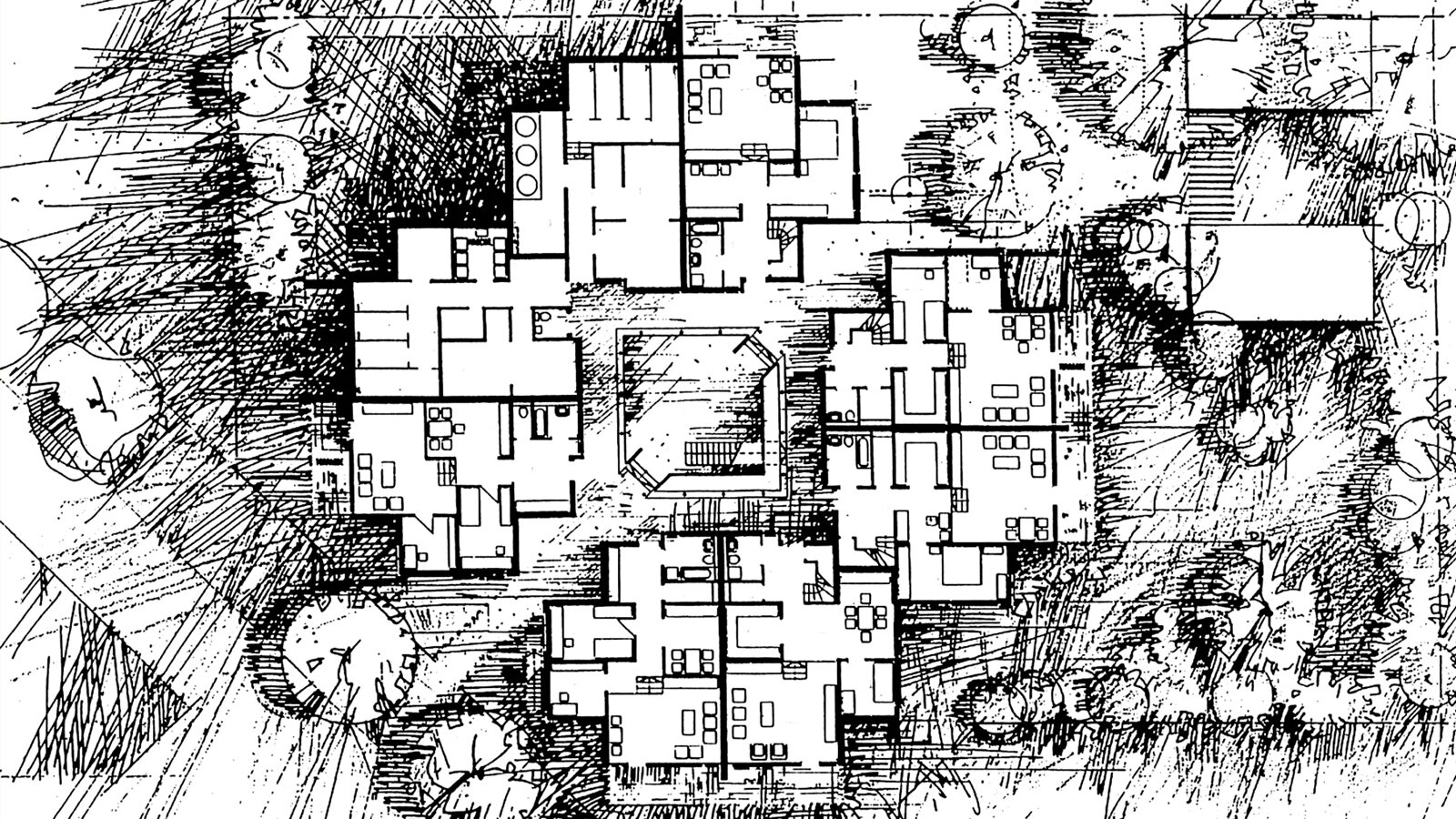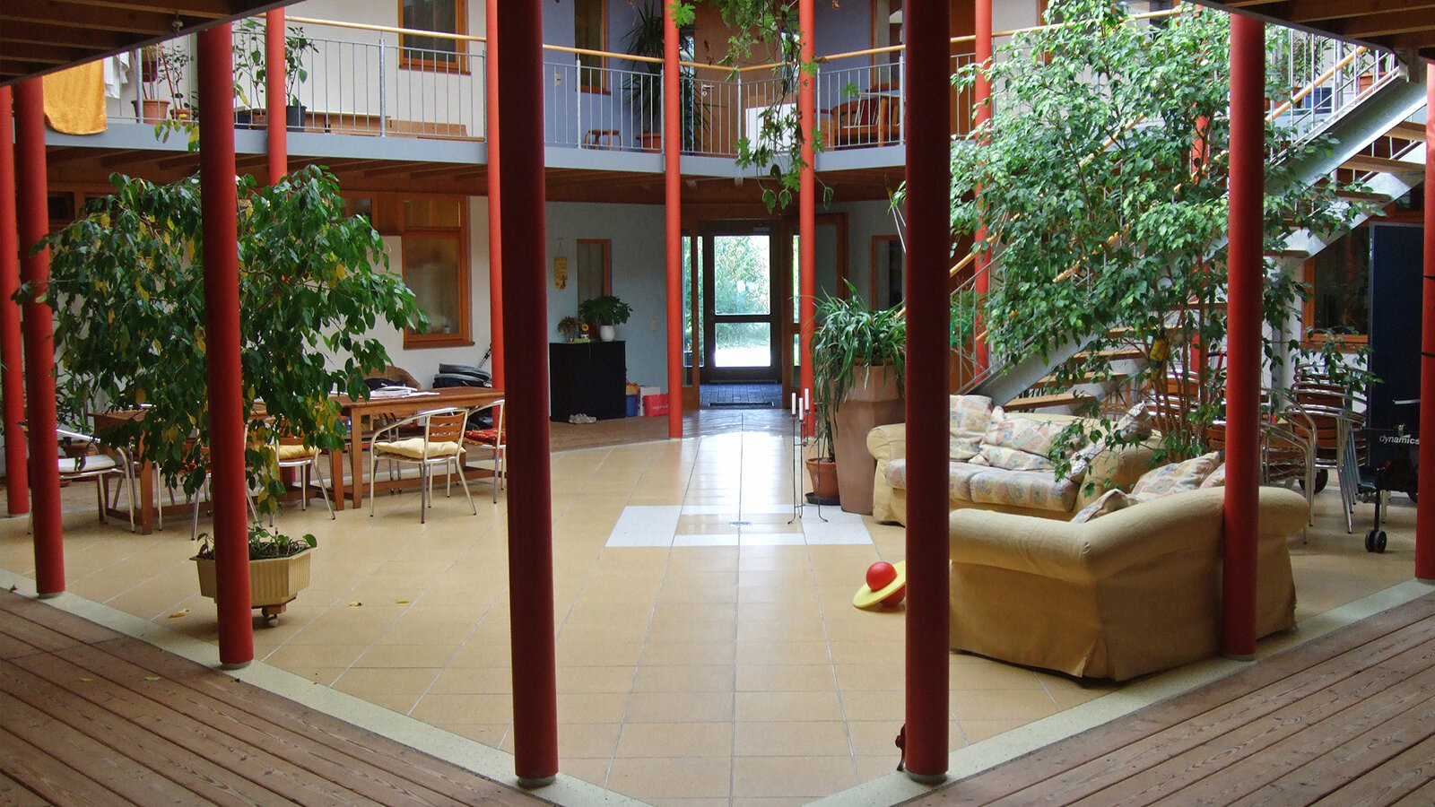 Die Bauherrschaft – bestehend aus acht Familien – wollte über den individuellen Wohnkomfort hinaus in einer tragfähigen Gemeinschaft leben, in der dem Bedürfnis nach größerer sozialer Einbindung Rechnung getragen wird. Dieser Idee entsprechend gliedert sich der Wohnhof in eine mittig angeordnete, glasgedeckte Halle, um welche sich acht Einfamilienhäuser gruppieren. Sie bietet als verbindender Kommunikationsbereich Raum für betreutes Spielen und gemeinsame Aktivitäten. Über einen Galerieumgang lassen sich die Obergeschosse der Wohnhäuser separat erschließen. Dies ermöglicht die geschossweise Teilung eines jeden Hauses in zwei Wohneinheiten, um sie dem Wachsen und Schrumpfen der Familien anzupassen.