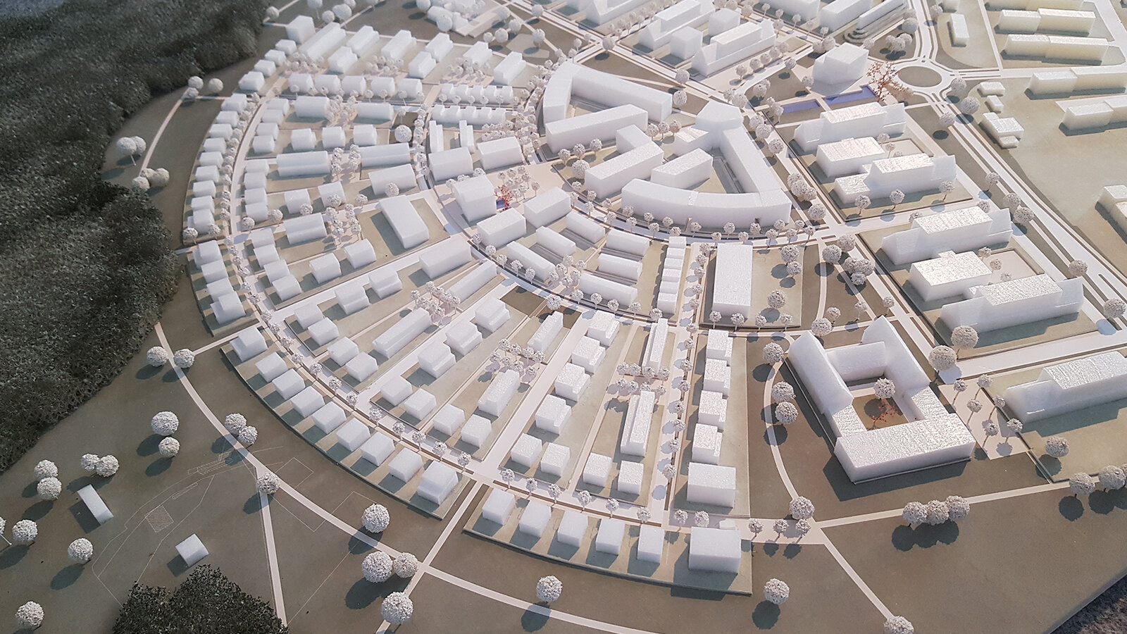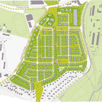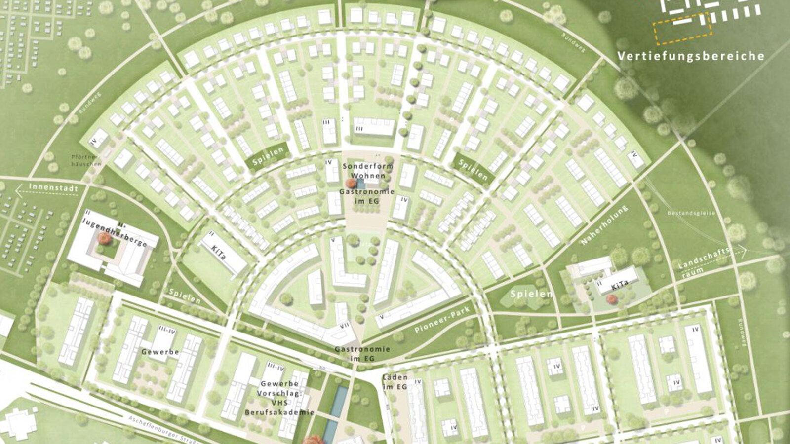 Der städtebauliche Entwurf nimmt daher bestehende räumliche Grundelemente der Kaserne wie die Mittelachse, die radiale Struktur und Bestandsgebäude auf und definiert sie neu. So wird die Mittelachse als prägnante Wegeverbindung beibehalten aber ausdrucksstark von der neuen Parkanlage überschrieben. Entlang der alten Mittelachse und Wegeverbindung lagern sich nun Quartierseingang, Park und Quartiersplatz an und führen den Nutzer über diese Freiräume in den Landschaftsraum.
