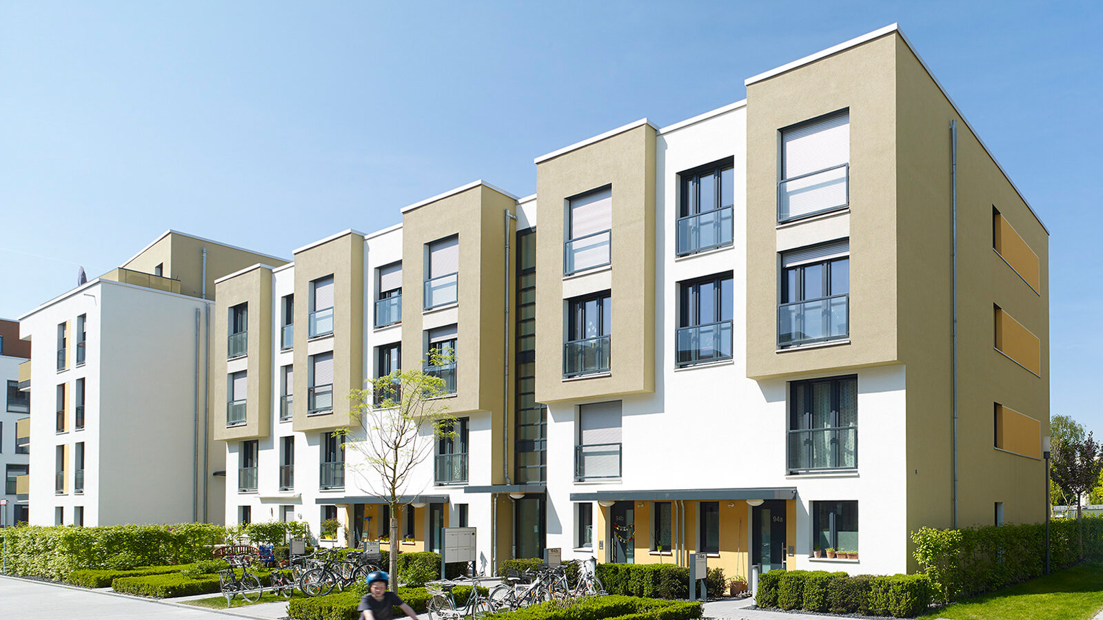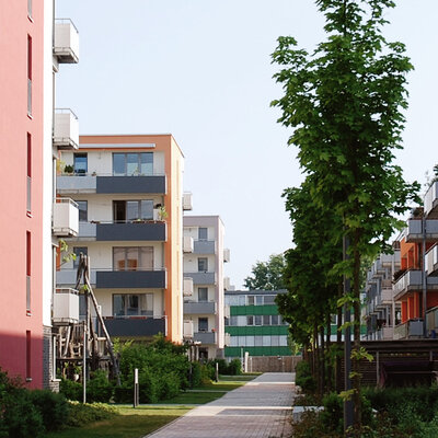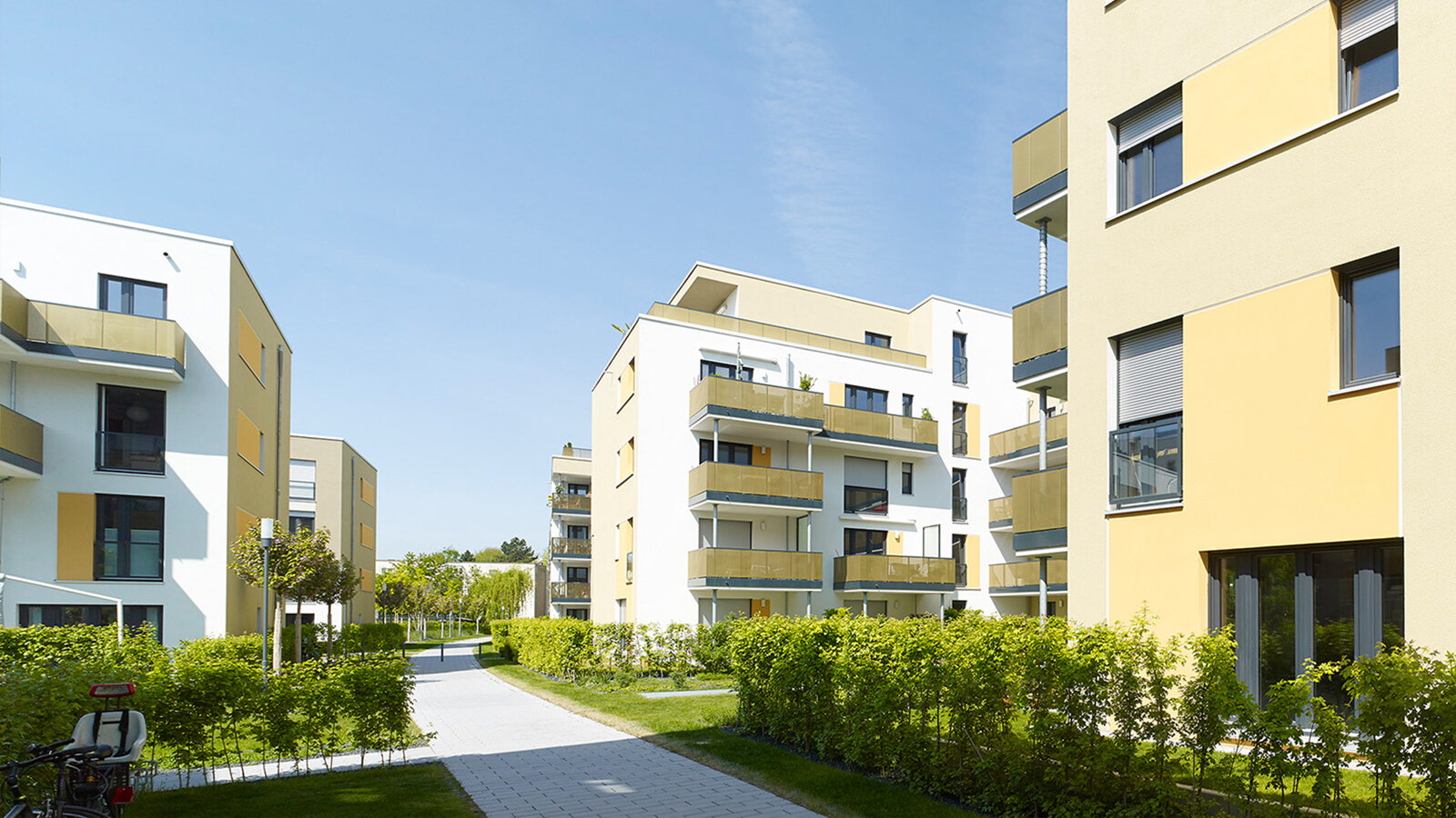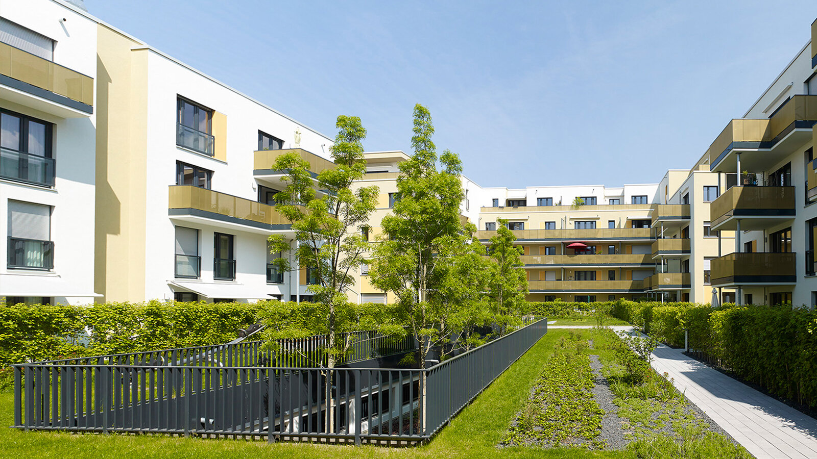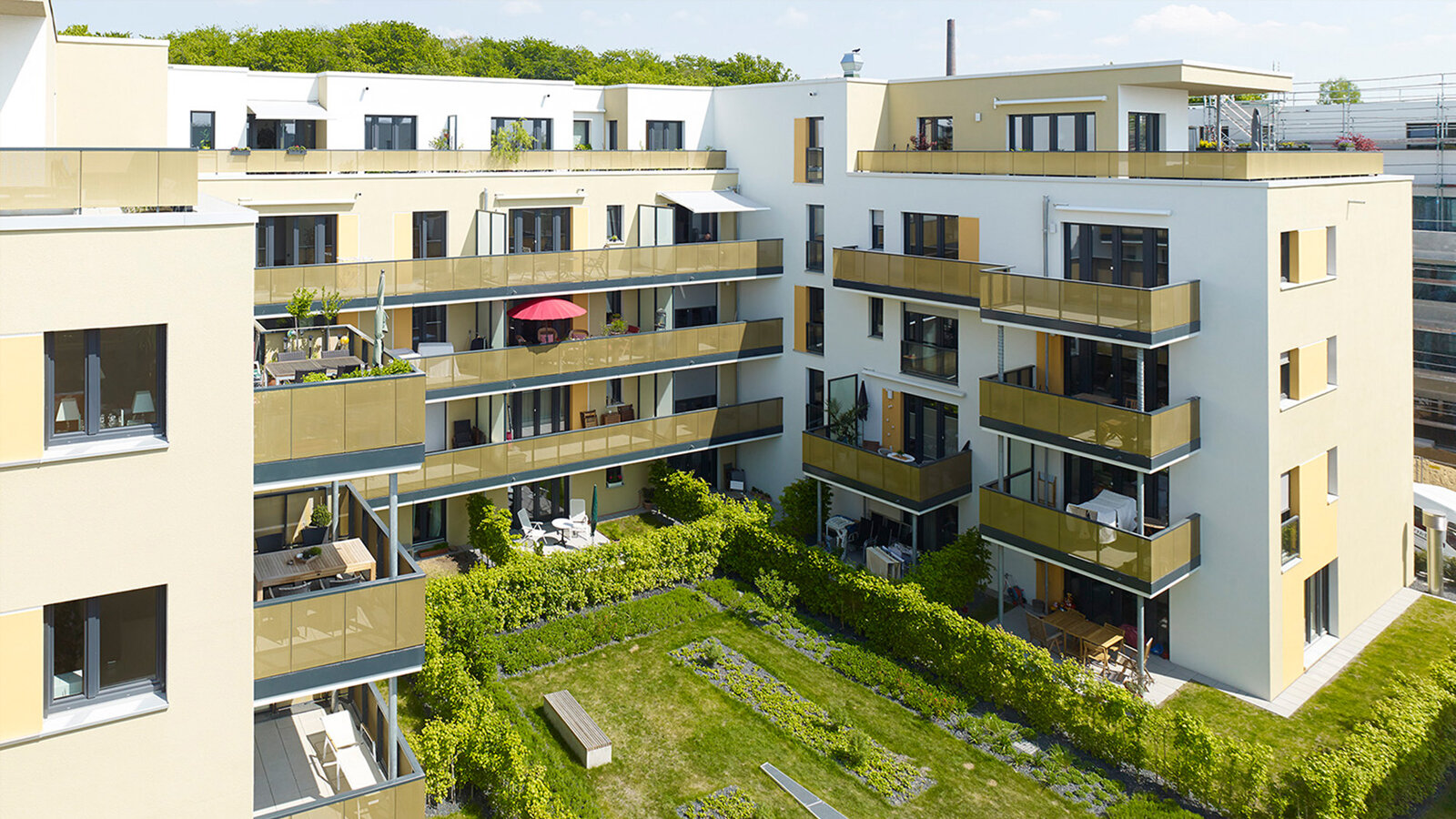 Das Wohnviertel Vorgebirgsgärten auf dem ehemaligen DuPont-Gelände in Köln umfasst insgesamt 165 Stadtwohnungen. Durch seine optimale Anbindung an die Innenstadt und die unmittelbare Nähe zum Vorgebirgspark befindet sich das Viertel in einer zentralen, aber auch idyllischen Lage. Das Baufeld 1 besteht aus 13 vier- bis fünfgeschossigen Wohnhäusern, die durch ihre blockartige Bebauung großzügige Innenhöfe ausbilden. Dadurch entsteht die Möglichkeit, soziale Kontakte und nachbarschaftliche Beziehungen zu pflegen. Die Innenhöfe bieten zusätzlich Raum für Sitzgelegenheiten sowie Wasser- und Sandflächen. Alle Wohnungen haben privaten Zugang zu Gärten, einer Terrasse, Loggia, Balkon oder Dachterrasse.