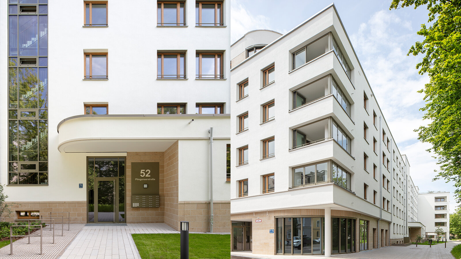Im Zuge der Entwicklung wurden ehemalige Gewerbebauten entlang der Plinganserstraße durch moderne, sechsgeschossige Wohnhäuser ersetzt. Ergänzend entstanden zwei Gebäude an der Karwendelstraße, ein Bestandsgebäude wurde aufgestockt und vier weitere energetisch modernisiert. Der Neubau an der Plinganserstraße bildet einen klaren Rücken zur stark befahrenen Straße und entwickelt gemeinsam mit dem Bestand eine Kammstruktur mit geschützten Innenhöfen, die ruhige, grüne Freiräume mit hoher Aufenthaltsqualität schaffen.