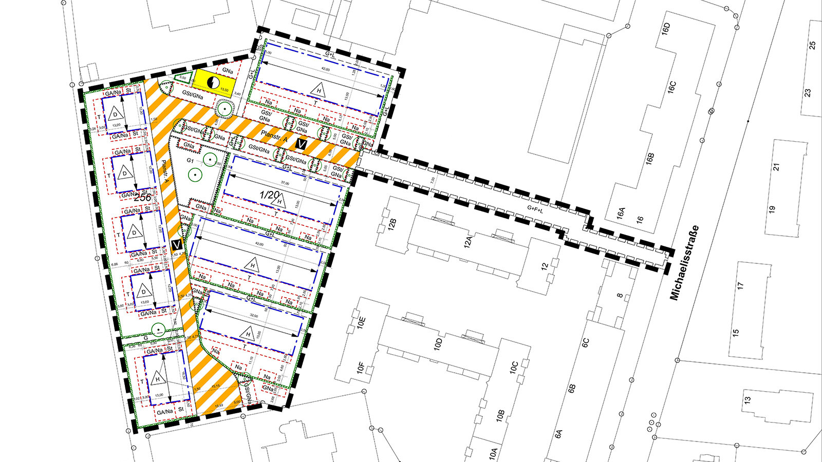 Die Erschließung des Plangebiets wird über das östlich gelegene Flurstück Nr. 1/21 an die Michaelisstraße hergestellt und verläuft in Form einer gespiegelten „7“. Die innere Erschließung endet in einem kleinen Wendehammer.