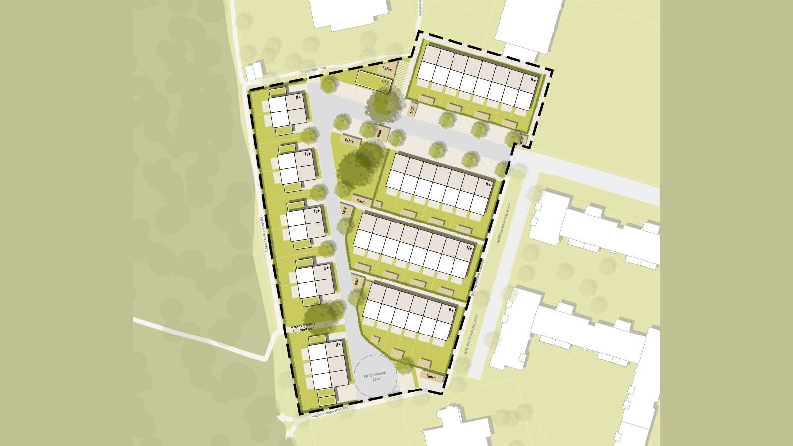 Auf Basis der geschilderten städtebaulichen Chancen und Rahmenbedingungen für das Areal wurde ein städtebauliches Gesamtkonzept entwickelt, welches eine aufgelockerte Wohnbebauung mit einer Doppel- und Reihenhausstruktur vorsieht.