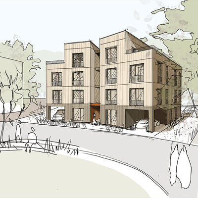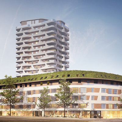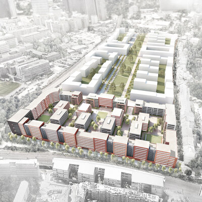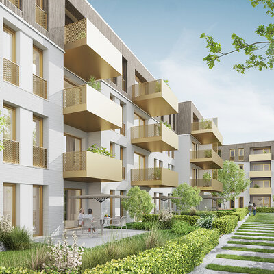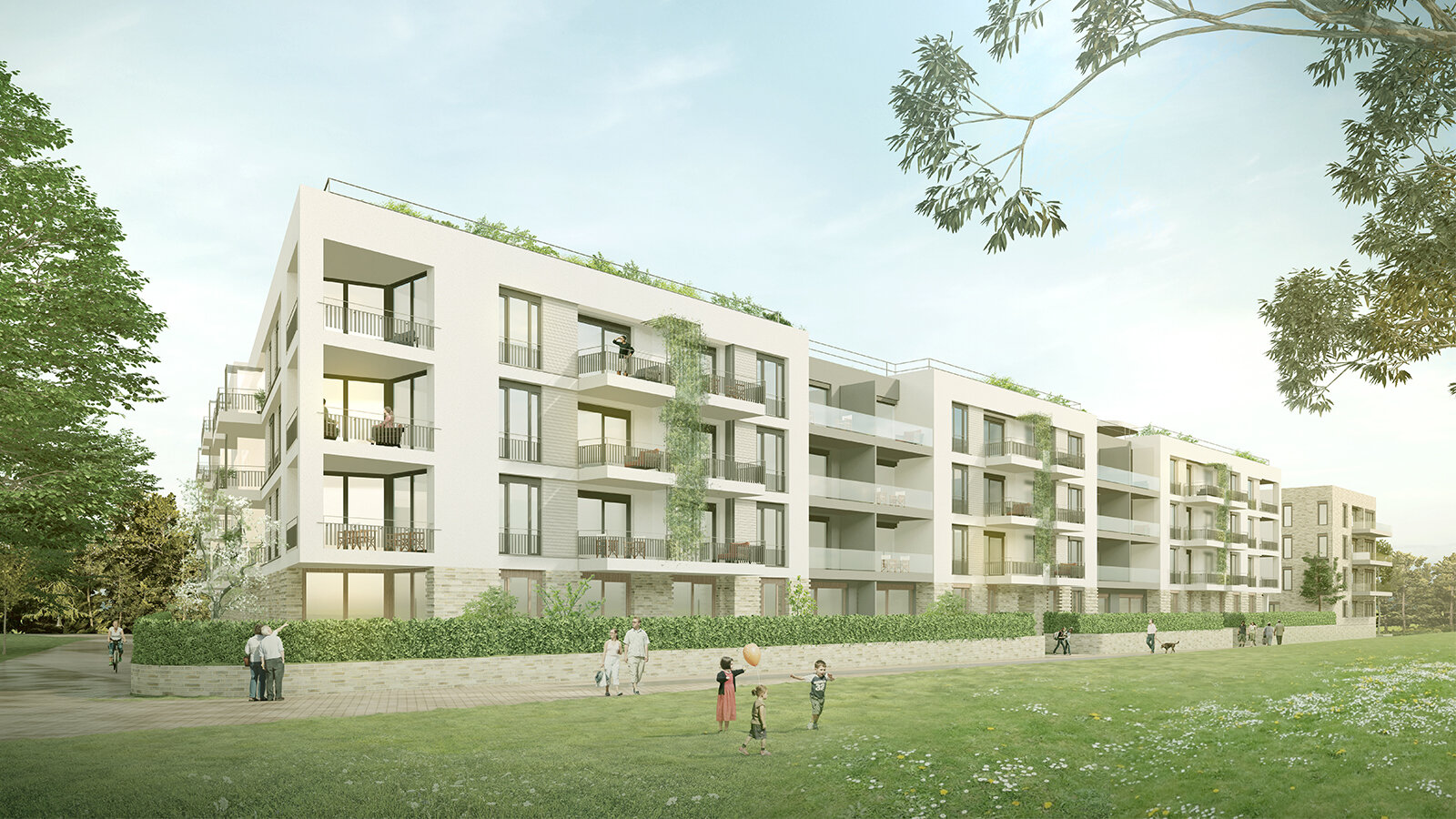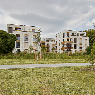 Das Konzept sieht eine klar rhythmisierte Gebäudestruktur vor: Die einzelnen Gebäude werden durch die Kubatur, die Materialität und die differenzierte Fassadengestaltung ablesbar. Ein gemeinsamer Sockel, der sich durch den strukturierten Klinker von der Fassade der Obergeschosse absetzt, bildet den gestalterischen Rahmen und schafft ein qualitätvolles Wohnumfeld und eine hochwertige Adresse. Die klare Gliederung der Gebäude ist in den Grundrissen ebenfalls deutlich ablesbar und wird zusätzlich durch die Gestaltung der Freiräume die unter dem Gebäude durchzufließen scheinen, unterstrichen.