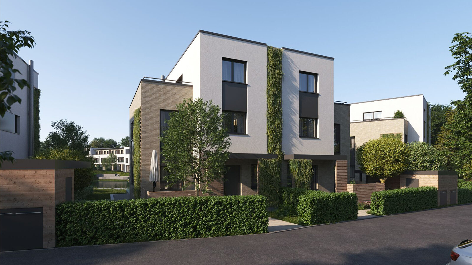 Durch ihre lockere Anordnung erhalten fast alle der 20 Reihenhäuser, 22 Doppelhäuser und weitere 5 Einzelhäuser einen direkten Blick auf das Wasser. Im Westen dient die geschlossene Reihenhauszeile als passiver Schallschutz gegenüber dem angrenzenden Biergarten. Die bestehende Baumallee wird als charakteristisches Merkmal und schützenswertes Naturdenkmal komplett erhalten.
