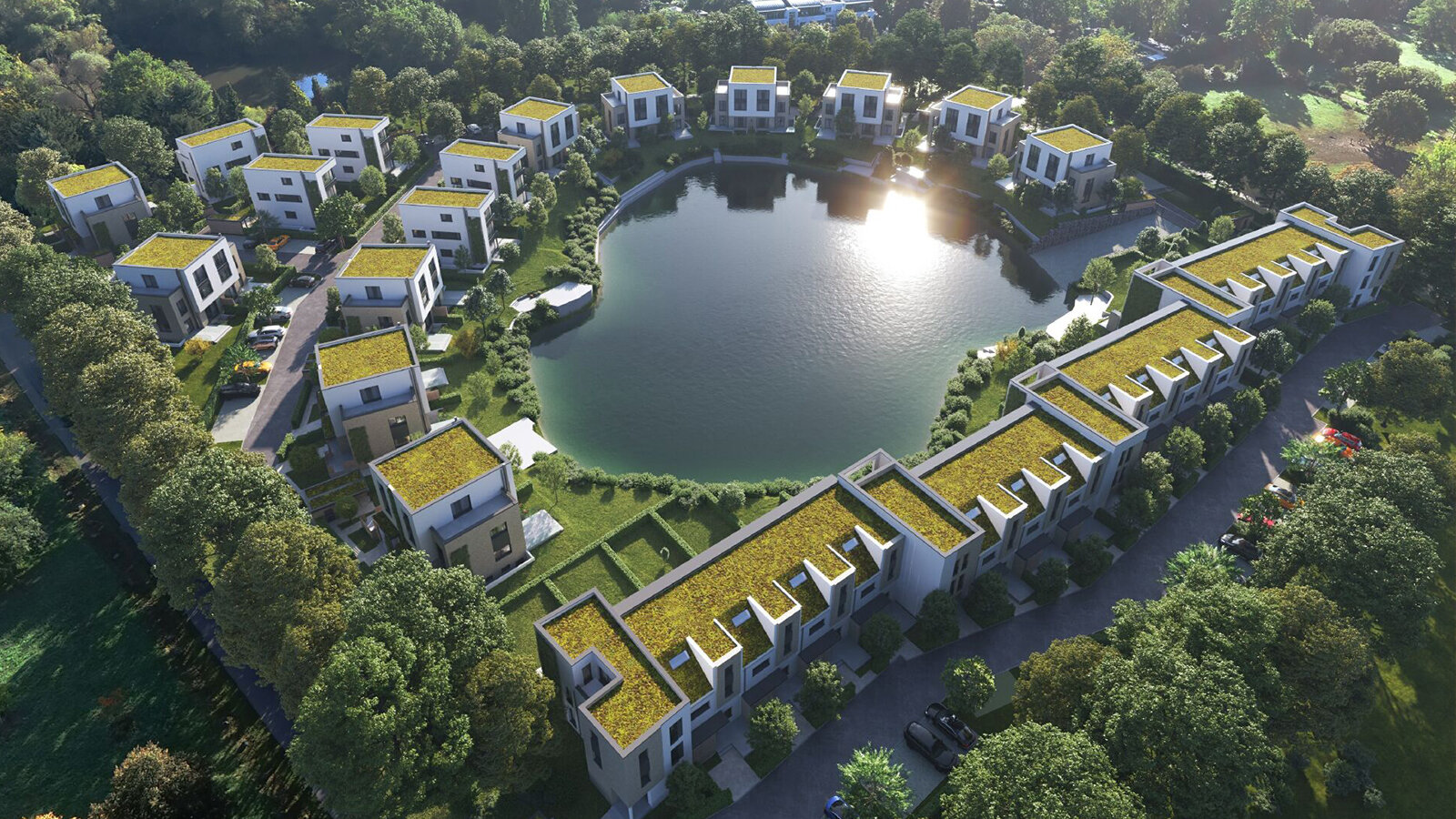 Die Wohnhäuser verfügen über zwei Vollgeschosse mit zusätzlichem Staffelgeschoss und extensiv begrünten Dachflächen. Diese begünstigen die kleinklimatische Situation und tragen zur Rückhaltung des im Baugebiet anfallenden Niederschlagswassers bei. Insgesamt führen zwei private Wohnwege rund um den See und erschließen die Häuser von der seeabgewandten Seite. Zusätzliche Wegeverbindungen ermöglichen eine fußläufige Durchquerung des Gebiets.