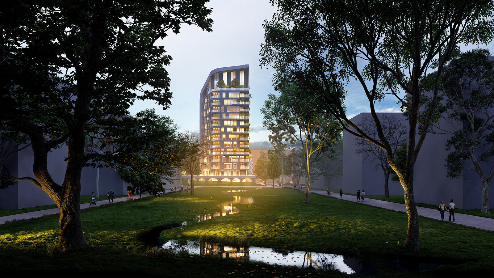 Alle vier Neubaukomplexe sind als Solitärbauten erlebbar, zeigen jedoch mit der Ausrundung einzelner oder mehrerer Gebäudeecken ein gemeinsames Gestaltungsmerkmal. Darüber hinaus verbinden die Solitäre einen hohen Begrünungsanteil der Fassaden und Dachflächen. An den zwei lärmbelasteten Seiten verhindern verglaste Balkonzonen und eine Lärmschutzbebauung mit Gewerbeeinheiten den Schallübertragung in die angrenzende Bebauung.
