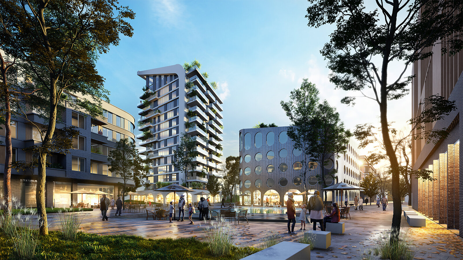 Das Areal erhält eine eingeschossige, gemeinsame Tiefgarage mit über 300 Stellplätzen, die durch ein Zwischengeschoss mit Fahrradstellplätzen und Abstellräumen ergänzt wird. Der Entwurf umfasst innovative Klima-, Energie- und Verkehrskonzepte, die ein nachhaltiges und lebendiges Quartier ermöglichen.
