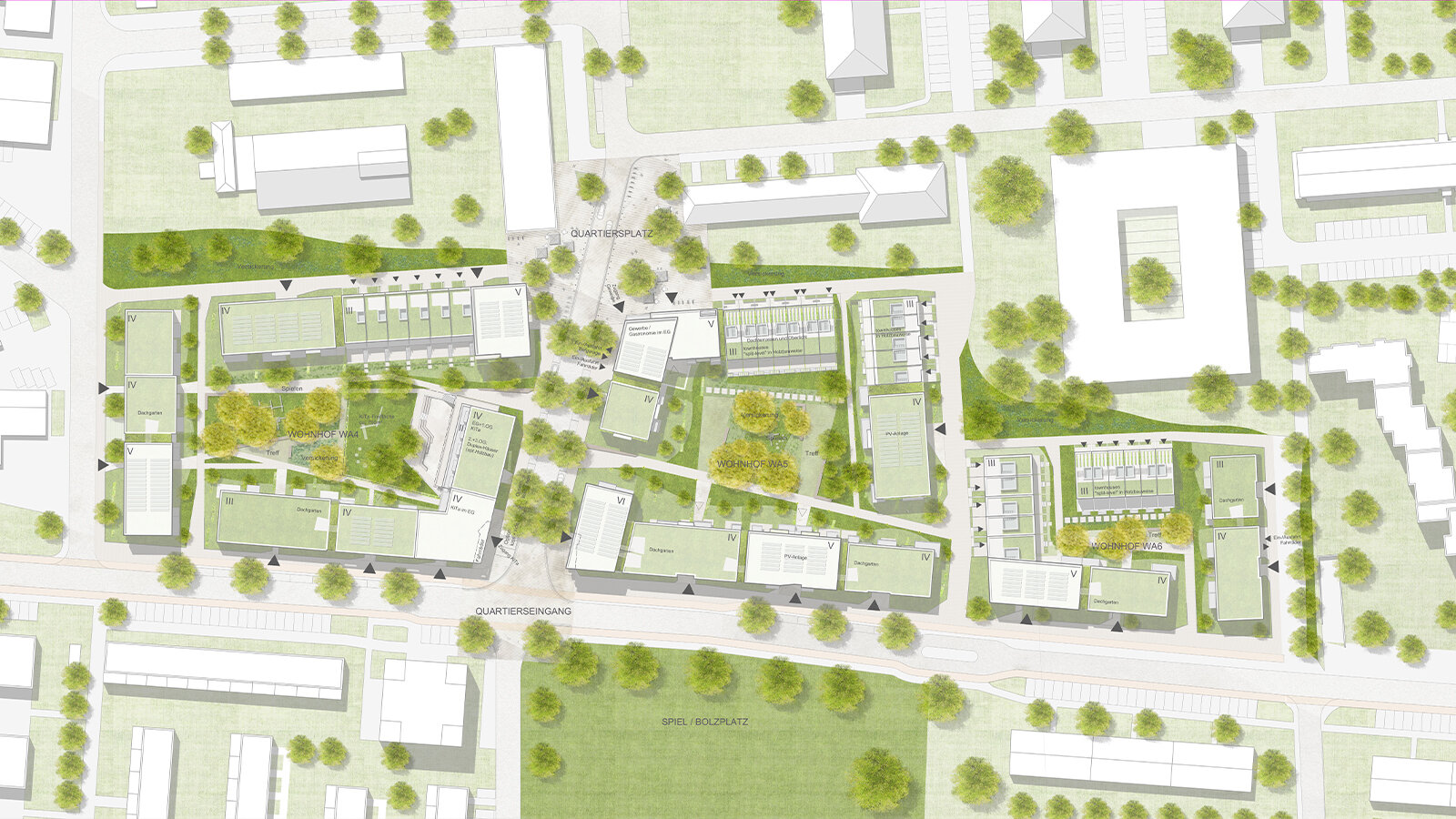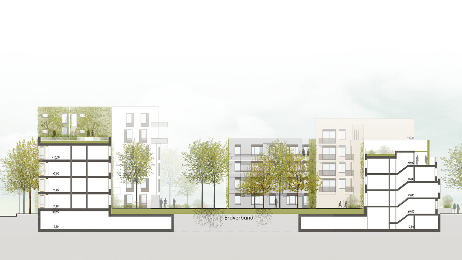 Die Tiefgaragen sind mit zusätzlichen Fahrradrampen, E-Bike-Lademöglichkeitenund vielen Fahrradstellplätzen ausgestattet und lassen die Innenhofflächen frei. Somit können die grünen Höfe als erdverbundene Retentionsflächen wirken. Die Neubauten besitzen extensiv begrünte Dachflächen, die teilweise mit PV-Modulen versehen werden. Die Townhouses in Holzbauweise bieten eine Alternative zu den klassischen Bauweisen und sind somit zukunftsorientiert und nachhaltig. Zudem soll Holz als Material in Teilen auch in der Fassade ablesbar sein. Der Duplex Haustyp auf der Kita wird ebenfalls in Holzbau vorgeschlagen. Die Geschosswohnungsbauten sind hingegen in Massivbauweise mit klimaneutral produzierten Dämmziegeln geplant.