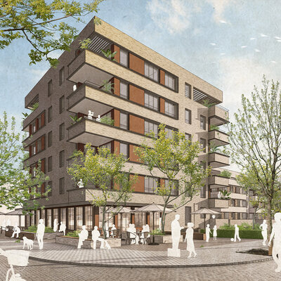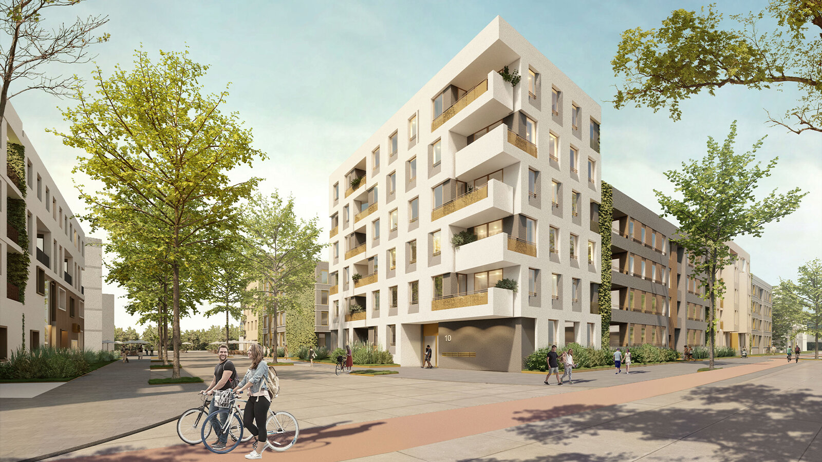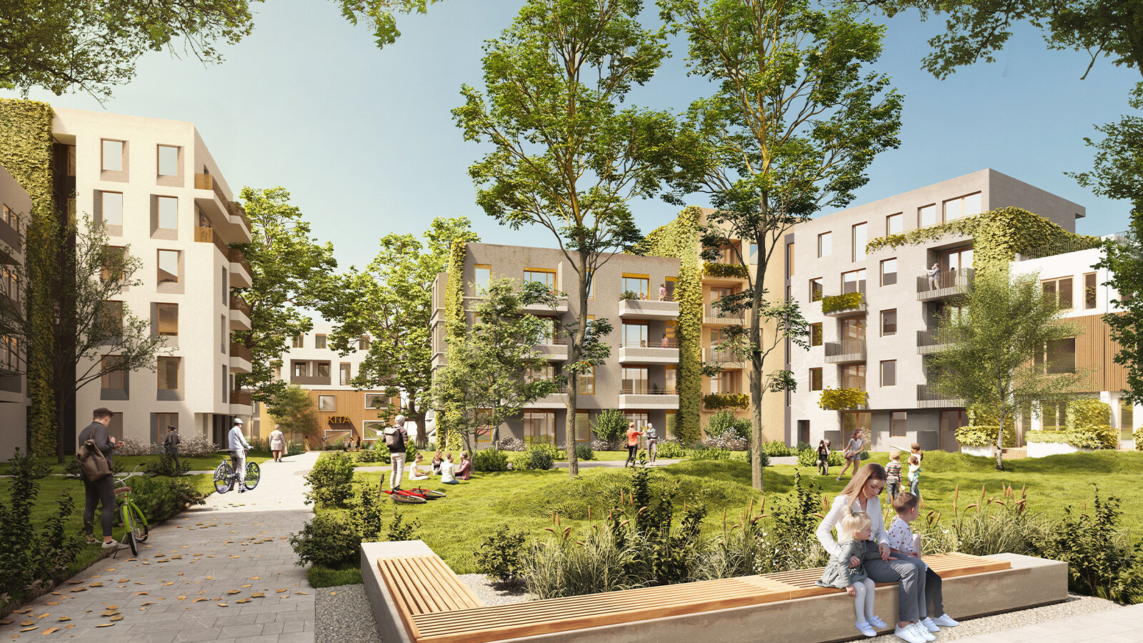 planquadrat entwickelte in den drei Blöcken eine große Varianz an Wohnformen, um unterschiedlichen Lebenssituationen eine Heimat zu bieten. Als offene Blockrandbebauung umschließt jeweils ein Mix aus Geschosswohnungsbauten und kleinteiligen Townhouses die lebendigen, halböffentlichen Höfe. Diese dienen als Begegnungsort für das gesamte Quartier, während sich die privaten Freiräume als Dachgärten abbilden.