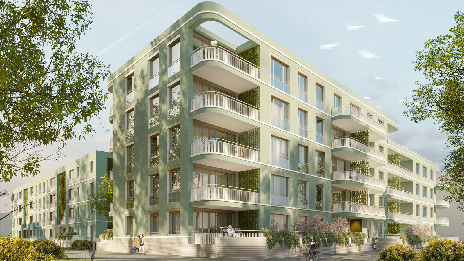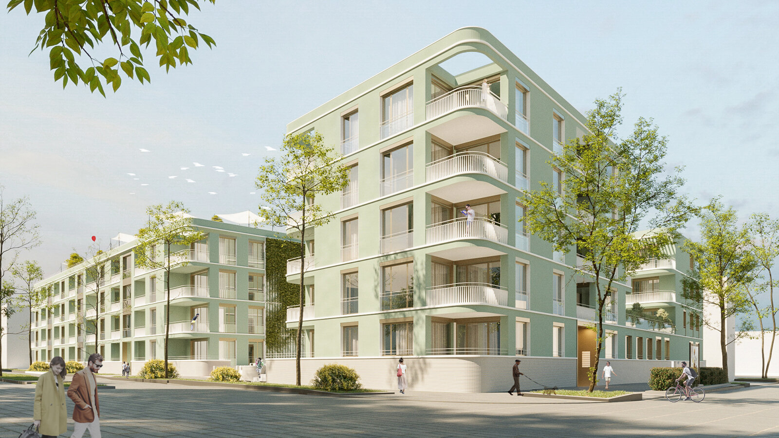 Zentral im neuen Mainzer Quartier Heiligkreuzviertel gelegen, entspricht das Baufeld 9 laut Bebauungsplan dem Typus einer Wildmühle und grenzt an die Ringstraße und zwei autofreie, begrünte Promenaden an. Dementsprechend zeigt die Neubauplanung eine geschlossene Fassade mit Loggien zur Straße hin und transparente, begrünte Fassaden zum Hof und zur Promenade. Farblich heben sich die Neubauten bewusst von der Umgebung ab und sind – wie der Projektname „Jade“ verrät – in hellen Grüntönen gehalten.