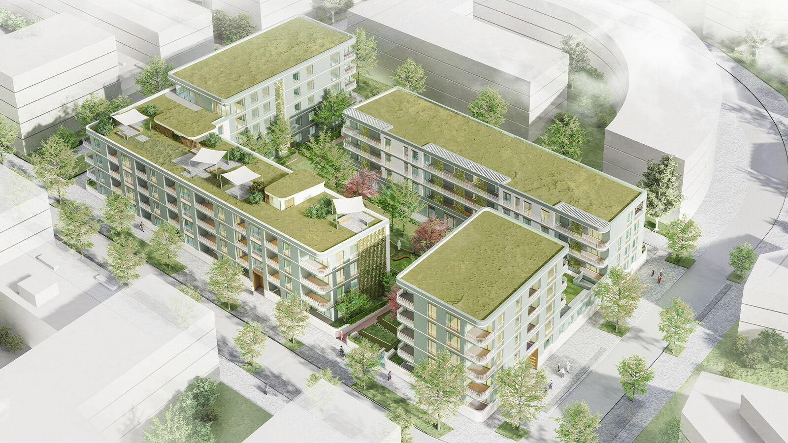 Die Wohnungen sind effektiv organisiert und nutzen die maximale Gebäudetiefe des Bebauungsplans vollständig aus. So können 106 Wohneinheiten verwirklicht werden. Durchgesteckte Treppenhäuser erschließen die Neubauten, so dass eine Adressierung von der Straßenseite und eine weitere Zugänglichkeit zum Hof möglich werden. Die Höfe sind als gemeinschaftliche Flächen geplant, die durch einen privaten Dachgarten für die Hausgemeinschaft ergänzt werden. Die übrigen Dachflächen werden für Photovoltaikanlagen genutzt.