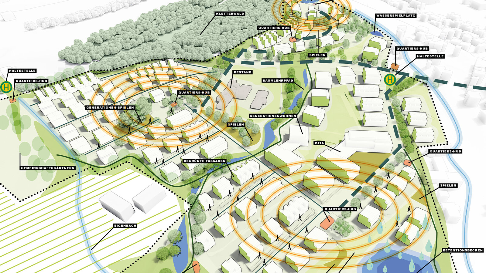 Die privaten- und öffentlichen Freiräume ermöglicht den Bewohnern eine Vielfalt an Nutzungsqualitäten. So finden sich neben Spielbereichen für Kinder und Jugendliche, private Gärten und begrünte Wege auch Nachbarschaftstreffpunkte im Bereich der Quartiershubs in jedem der drei Subquartiere. Ein großer Spielplatz soll zentral im westlichen Plangebiet ein attraktives Spielangebot für alle Kinder und Jugendliche schaffen. Der hohe Anteil an öffentlichen und halböffentlichen Freianlagen soll viele Angebote generationsübergreifend machen. Ein Baumlehrpfad könnte im zentralen Grünzug den historischen Bezug zur Gärtnerei erzeugen, ebenso ist ein Wasserspielplatz angrenzend am Eigenbach im südöstlichen Teil des Gebiets geplant.
