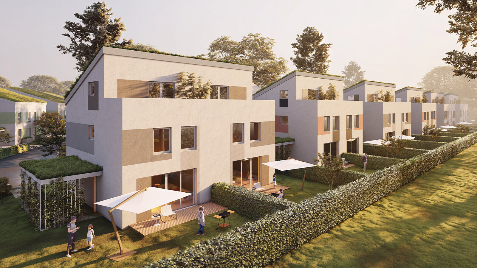 Auf der Grundlage eines gewonnenen Wettbewerbs entstehen im Wohnquartier Jahnstraße 55 unterschiedlich große Doppelhäuser in Modulbauweise. Auf dem südlichen Baufeld sind acht Doppelhäuser mit drei unterschiedlichen Typen des Strenger-Modulhauses geplant. Für das östliche Baufeld sind sechs Doppelhäuser vorgesehen. Aufgrund der Vorgaben des Bebauungsplans werden die Häuser mit Pultdächern ausgeführt und die Dachflächen für PV-Anlagen und Dachbegrünungen genutzt. Mit ebenfalls begrünten Fassadenflächen, wiederverwendbaren Baustoffen, regenerativen Energiequellen und E-Ladestationen am Haus überzeugen die Neubauten auch mit einem nachhaltigen Nutzungskonzept.
