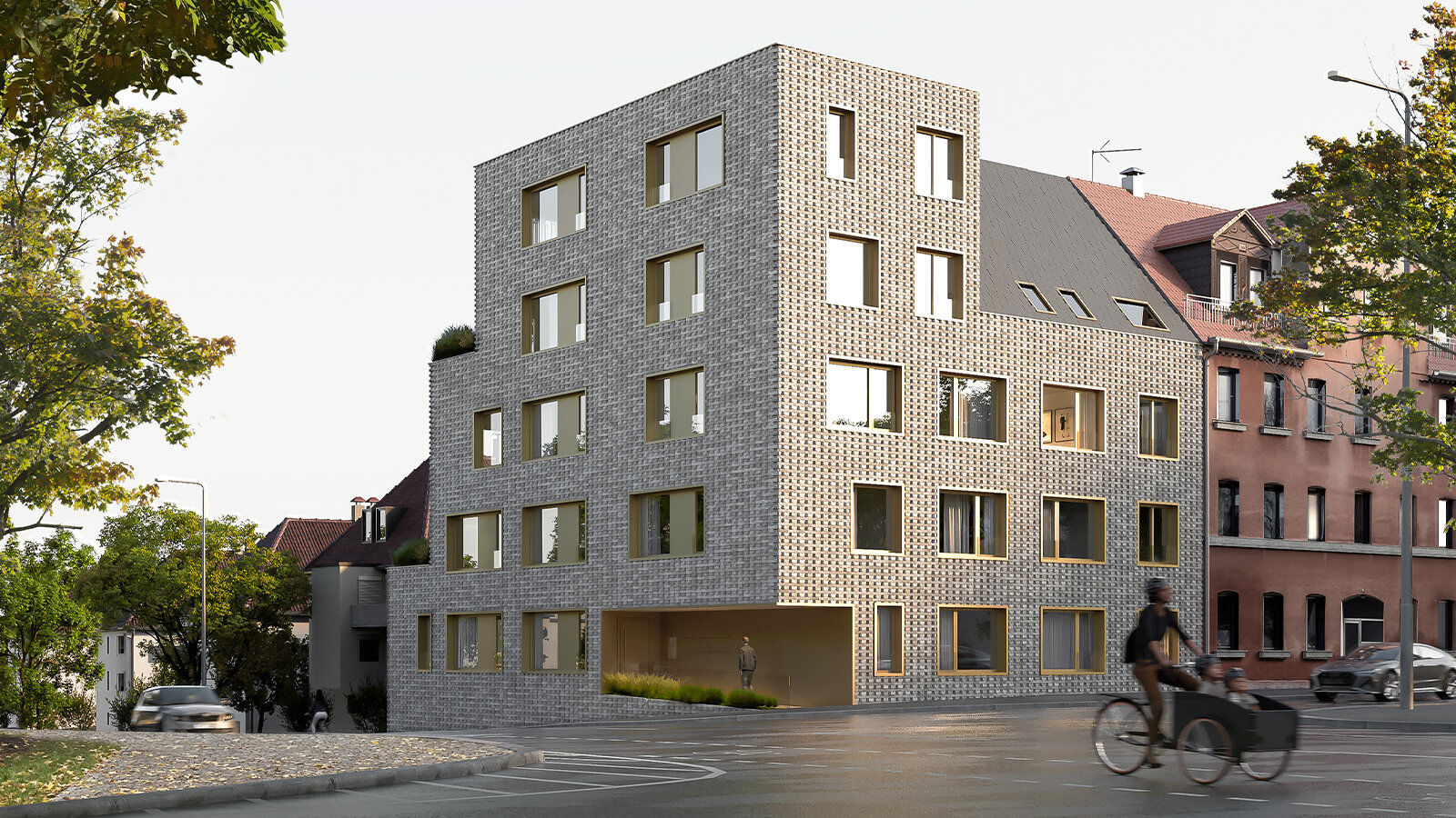 Unser Entwurf vermittelt zwischen den modernen Flachdach-Bauten und den denkmalgeschützten Altbauhäusern und Villen entlang der Hindenburgstraße. Die Dachprofile und Zwerchhäuser der direkt angrenzenden Denkmäler werden zeitgemäß aufgegriffen und abstrahiert interpretiert. Auch die geplante Ziegel-Fassade spiegelt den Stil der nahen Umgebung wider und trägt ebenfalls zu einem harmonischen, architektonischen Gesamtbild bei. Die versetzten Abstufungen auf der Rückseite bilden begrünte Dachterrassen mit integrierten Trögen für Pflanzen. Nachhaltige und wirksamen Dachgärten bieten den Bewohnern hier nicht nur eine Aussicht auf den bewaldeten Burgberg, gleichzeitig schaffen sie eine Verbindung zu der grünen Seite der Wohngegend. Der Eingangsbereich wird konsequent eingeschnitten und verstärkt an der Ecksituation die Wirkung des gesetzten Hochpunktes direkt an der Kreuzung. Die Höhenentwicklung ist durch die Abstufung auf der Rückseite und die markante Erhebung zur Kreuzung hin an die Nachbarschaft angepasst.