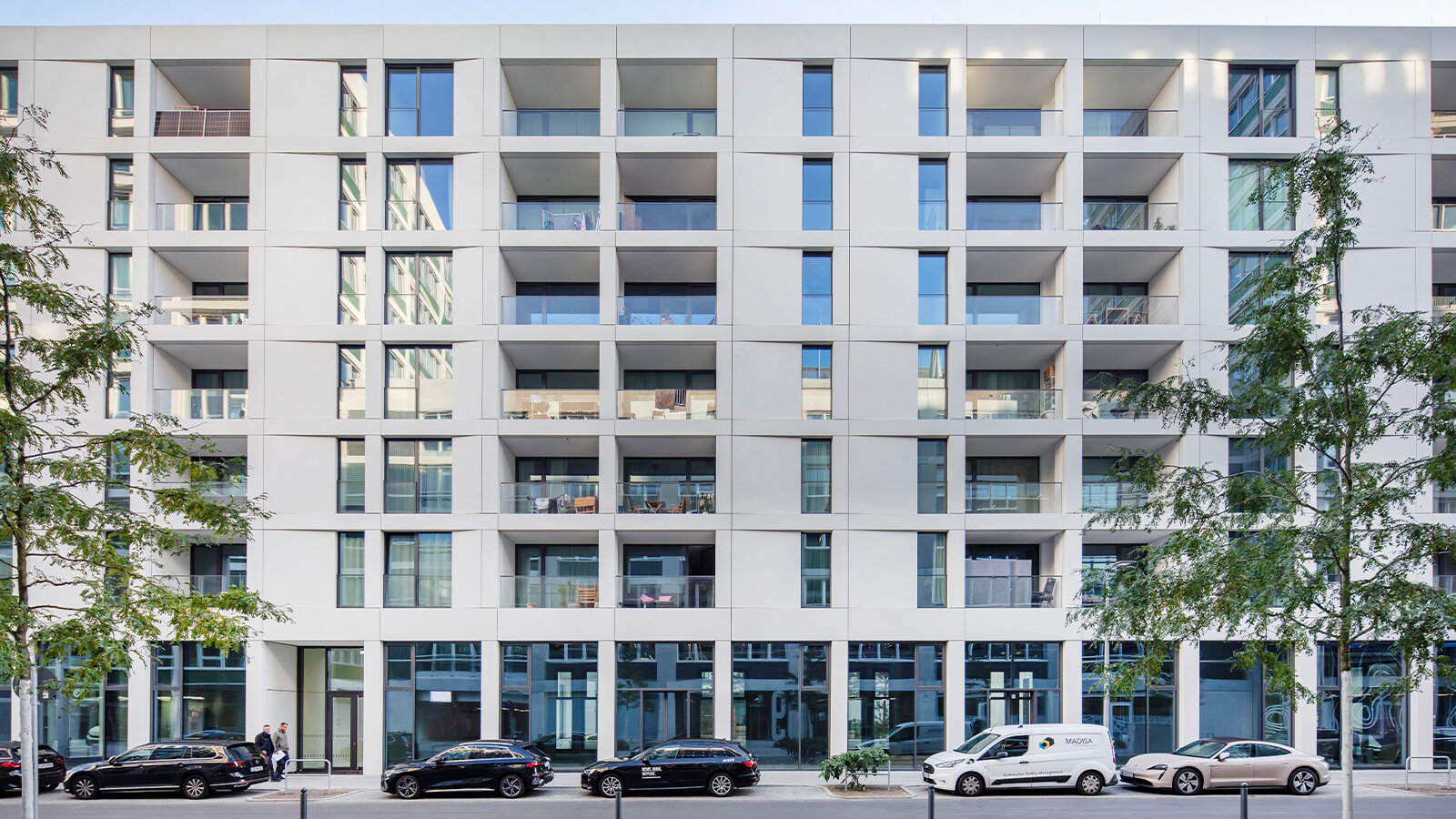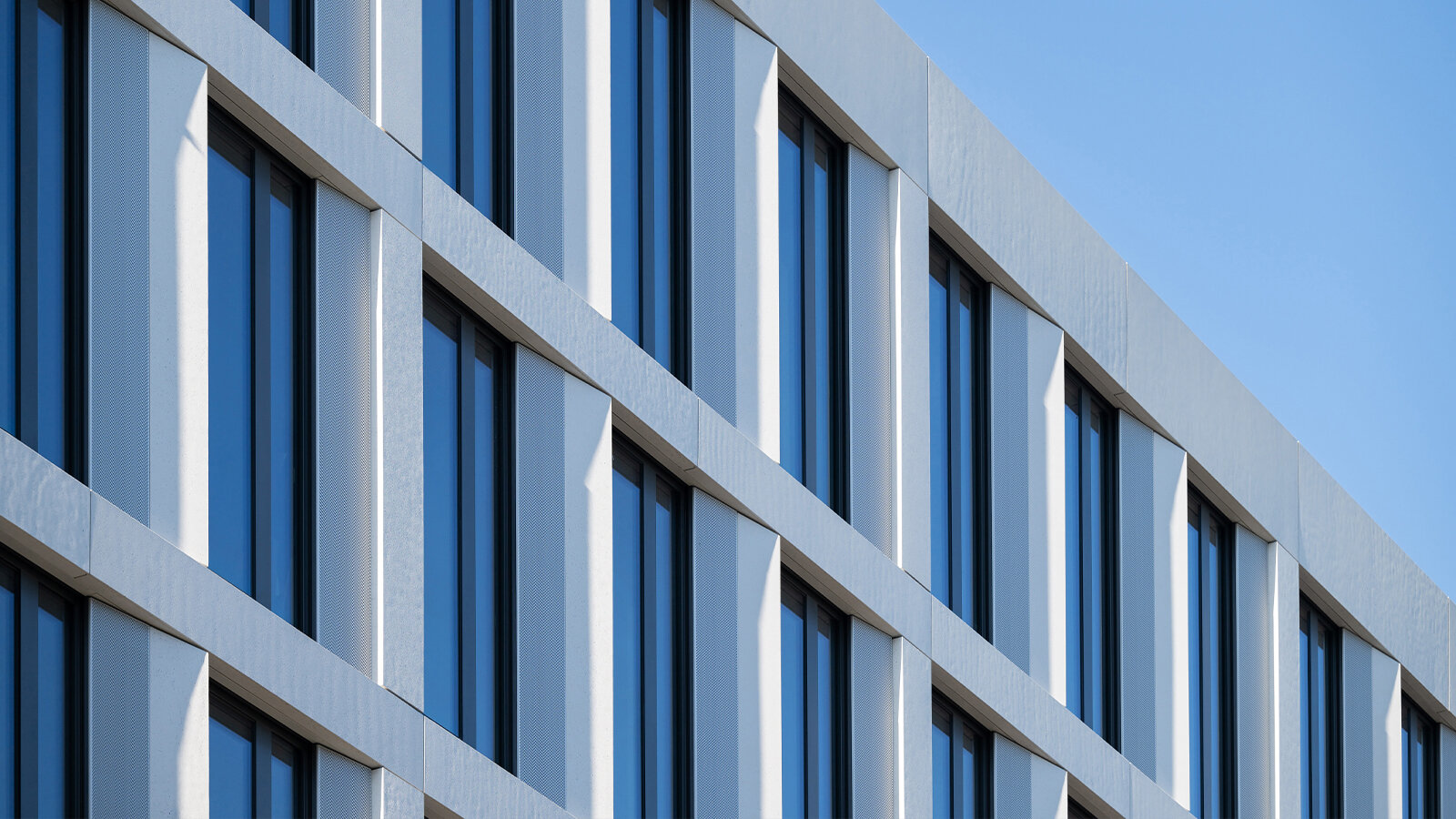 Die Fassade in den Obergeschossen ist geprägt durch das Spiel von geschlossenen Fassadenflächen, Fenstern und eingezogenen Loggien. Die geschlossenen Flächen sind leicht nach innen gedreht, was an etwas geöffnete Türen erinnert. Dadurch erscheint die Fassade offen und einladend. Dank der dreidimensionalen Gestaltung zeigt das Gebäude aus jeder Blickrichtung ein etwas anderes Bild.