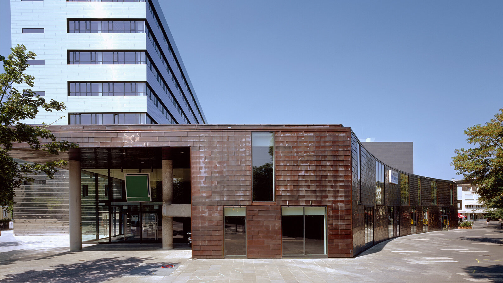 Das ehemalige Hertie-Kaufhaus befindet sich im Zentrum von Bonn-Bad Godesberg am Endpunkt einer Einkaufsstraße. Das über Jahre leer stehende Gebäude wurde grundlegend umgestaltet und neu strukturiert. Um eine Maßstäblichkeit bezogen auf das kleinteilige Umfeld sowie die Ablesbarkeit der Gebäudeeinheiten zu gewährleisten, gliedert sich das neue Gebäude in drei Teile. Diese unterscheiden sich sowohl in ihrer Kubatur als auch Materialität. Das mit hochglänzendem Edelstahl verkleidete Hochhaus spiegelt den Himmel, das Licht und die jeweilige Außenwirkung wieder. Das Kaufhaus – ein kubischer Baukörper mit Eternitfassade – nimmt sich in Wirkung und Farbigkeit zurück, so dass der Blick auf die großzügig gestaltete Schaufensterfront gelenkt wird.